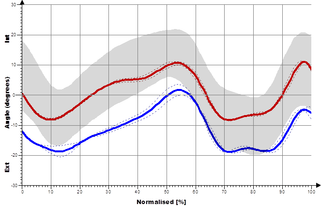 Das Hüftgelenk kommt im Wesentlichen einem idealen Kugelgelenk gleich. Die Belastung entspricht dem Mehrfachen des Körpergewichts, scheint sich aber für das Standbein im Gehen nicht merklich von der Belastung im Einbeinstand zu unterscheiden (Kummer 2005). Es setzen sowohl ein- als auch zweigelenkige Muskeln an, deren Funktion sich je nach Gelenkstellung deutlich ändern kann. Während des Gangzyklus erfolgen Bewegungen in Extension / Flexion (Abbildung 6), Abduktion / Adduktion (Abbildung 7) und Rotationsbewegungen (Abbildung 8). In der Initialphase werden die Extensoren isometrisch (haltend) aktiv um ein Einklappen des Stamms zu verhindern (Engl. Jackknifing= „Taschenmessern“). Im weiteren Verlauf kommt es durch eine zunehmend konzentrische (verkürzende) Kontraktion der Extensoren zu einer Bewegungsumkehr, während der mittleren Standphase erfolgt so die Hüftextension. Dieser Richtungswechsel erfolgt mit Bodenkontakt der Gegenseite in der Vorschwungphase. Zum Ende der Standphase kommt es zu einer Hyperextension, die Hüftextensoren arbeiten nun isometrisch (haltend) und die Flexoren exzentrisch (bremsend). Die Flexion zu Beginn der Schwungphase erfolgt durch eine konzentrische Aktivität der Flexoren. Zum Ende der Schwungphase kommt es dann zu einer exzentrischen Aktivierung der Extensoren.