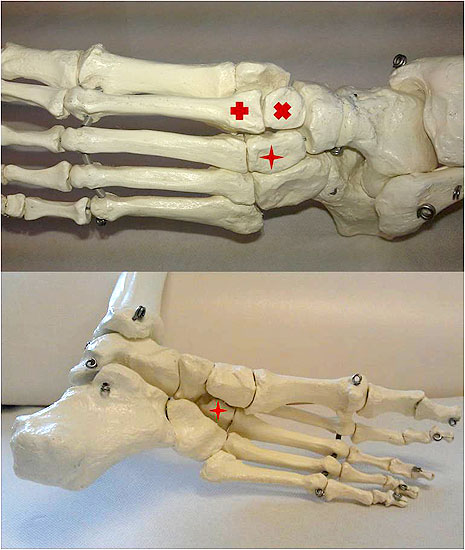 Die Gelenke zwischen Os naviculare, Ossa cuneiformia und Os cuboideum werden gemeinhin als Amphiarthrosen betrachtet, weisen aber nach Ouzounian und Shereff eine Beweglichkeit von ca. 5° Extension / Felxion bzw. Pronation / Supination auf 29. Die Ossa cuneiforme 2 und 3 sowie die Basis des Meatarsale 2 spielen im statischen Schlusstein-Modell eine tragende Rolle (in der Architektur ist der Schlusstein ein keilförmige Stein am höchsten Punkt eines Gewölbes oder eines Bogens durch den die Konstruktion sich selbst trägt) (Abbildung 28 und 29).