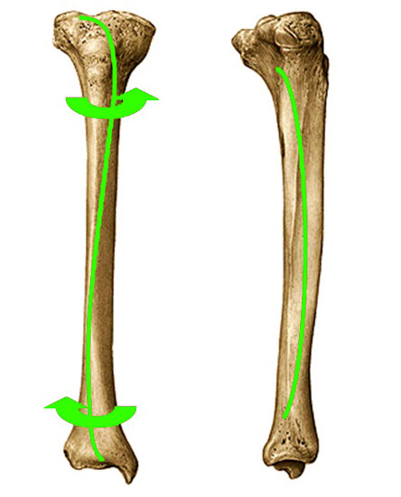 Anatomisch finden sich viele Hinweise auf die genannte Verschraubungsrichtung. Der Femur ist der größte spiralig gedrehte Röhrenknochen im Körper, die Verschraubung ist dabei dreidimensional: C-Bogen in der Sagitalebene, S-Bogen in der Frontalebene (Neigung der Schenkelhalsachse gegen die transversale Kondylenachse) und Rotation in der Horizontalebene (Antetorsion). (Abb. 1) Auch die Tibia ist verschraubt, C-Bogen in der Sagitalebene, S-Bogen in der Frontalebene (vom lateralen Tibeaplateau zum Malleolus medialis) und Rotation in der Horizontalebene (Tibiatorsion) (Abb. 2). Die Aufgabe des Beinskeletts besteht darin, die Belastung von oben nach unten und umgekehrt zu leiten. Dies wird durch den spiraligen Verlauf der belastungsstabilen Knochenachse gewährleistet.