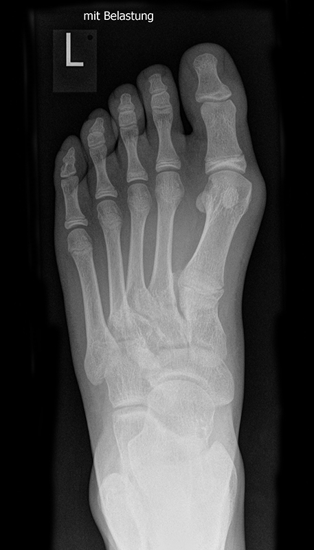 Sowohl die Eversion des Calcaneus als auch die Supination des Vorfußes führen zu einem Absinken des Längsgewölbes, zu einer Überdehnung der Tibialis posterior Sehne, zu einer vermehrten Supination des Os naviculare, zum plantaren Öffnen der Gelenke zwischen Os naviculare und Os cuneiforme mediale, sowie zwischen Os cuneiforme mediale und Os metatarsale I 2122. Weiterhin kommt es zu einer vermehrten Kompression in den dorsalen Gelenkabschnitten mit Supination des Os metatarsale I und langfristig zur Entwicklung eines Hallux valgus 23 mit Dorsalextensionsfehlstellung in den Zehengrundgelenken (Abb. 4). Der damit einhergehende Verlust der horizontalen Position des Talus zwingt die Tibia in eine relative Außenrotation, die weiterführend eine Außenrotation im Kniegelenk erzeugt und die oben beschriebenen Mechanismen unterstützt 18.