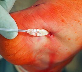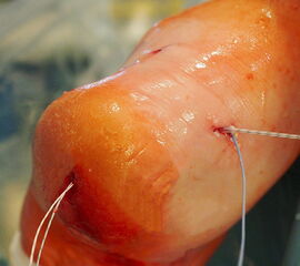 - Wundheilungsstörungen/Fistelbildung: das Risiko einer Wundheilungsstörung oder einer Fistelbildung kann durch einen sorgfältigen Wundverschluss deutlich reduziert werden. Die Portale sollten anstelle von Klammerpflastern o. ä. durch Einzelknopf- oder Einzelknopfrückstichnähte verschlossen werden. Bewährt haben sich 2 Nähte pro Portal, um die Haut sicher zu verschließen.