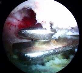 - Verletzung des posterioren tibialen Gefäßnervenbündels: durch die Ausrichtung der der Arbeitsöffnung der Instrumente (Shaver, Radiofrequenzsonde) nach lateral können die neurovaskulären Strukturen mit der geschlossenen Seite des Arbeitsgeräts geschützt werden. Das Risiko von Verletzungen wird deutlich vermindert, wenn medial der FHL-Sehne mit äußerster Vorsicht präpariert wird.