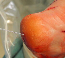 - Fakultativ: Blutsperre. Wird eine Blutsperre verwendet, sollte diese am Oberschenkel angelegt werden. Die Anlage am Unterschenkel führt zu einer Kompression des M. flexor hallucis longus was die Einschätzung der Sehnenspannung bei der Fixation erschwert, bzw. unmöglich machen kann.