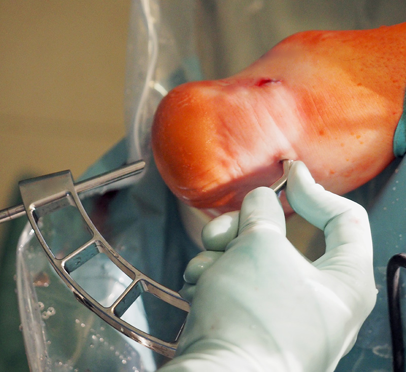 Nachfolgend wird die OP-Technik an einem linken Fuß unter Verwendung einer PEEK-Schraube veranschaulicht.