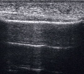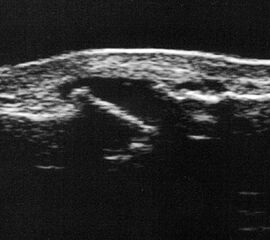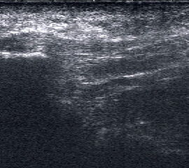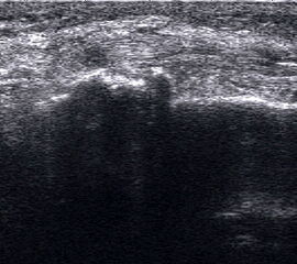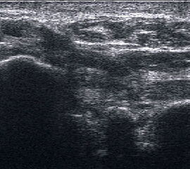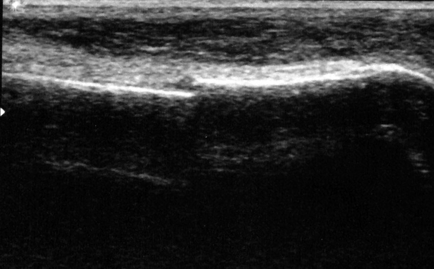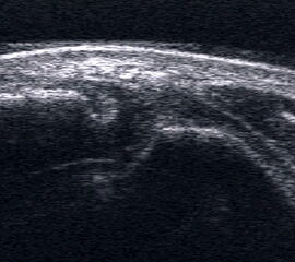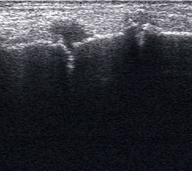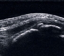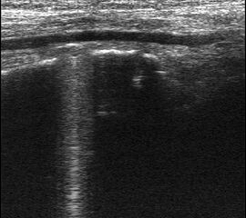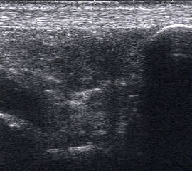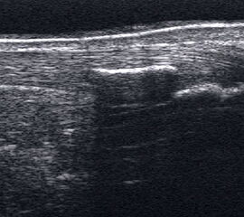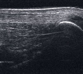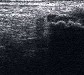 Referenzstrukturen: Knochen sehr oberflächennah als echogene Linie erkennbar. Daher Verwendung einer Vorlaufstrecke sinnvoll.