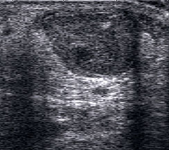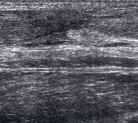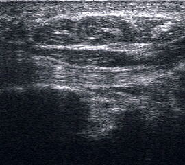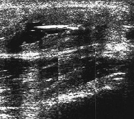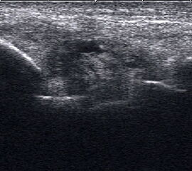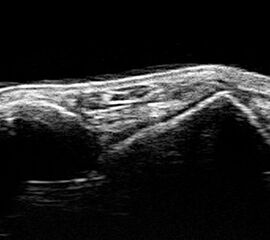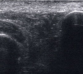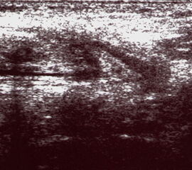 Befunde: Ein echoarmer Ring um die echogene Sehne ist Ausdruck der Flüssigkeitsumscheidung. Bei entzündlicher Ursache auf dem Boden einer rheumatologischen Erkrankung kommt es im zeitlichen Verlauf zum Übergang in eine chronische Tendinopathie. Durch Verklebungen mit dem Sehnengleitgewebe kann das Gleiten der Sehne behindert sein.