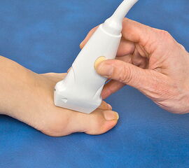 Die Sonographie stellt in der Abklärung von Verletzungen und Erkrankungen an Sprunggelenk und Fuß wie auch an anderen Bewegungsorganen den „verlängerten klinischen Finger“ dar. Das heißt, dass der Untersucher selbständig auffällige klinische Untersuchungsbefunde unmittelbar (bed side) (Abb. 1) strukturell, aber auch funktionell unter Sicht am Monitor (real-time) überprüfen kann 1. Technische Voraussetzung ist hierzu ein Ultraschallgerät mit Tauglichkeitsbescheinigung des Herstellers für Bewegungsorgane.