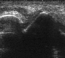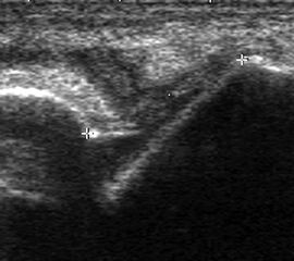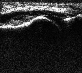 Der hyaline Gelenkknorpel ist nur in wenigen Gelenkabschnitten zugänglich, dort aber, besonders im Wachstum und mit höher auflösenden Schallköpfen gut zu beurteilen. Er stellt sich echoarm und glatt begrenzt dar. Darunter liegt echogen der subchondrale Knochen, darüber das mäßig echogene Gelenkkapselgewebe.