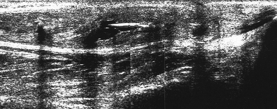 Nach operativer Versorgung einer Ruptur bleibt die Achillessehne in der Regel als Zeichen der Kompensation verdickt. Fadenmaterial bleibt lange als echogene Strukturen mit Schallschatten intratendinös sichtbar (Abb. 59).