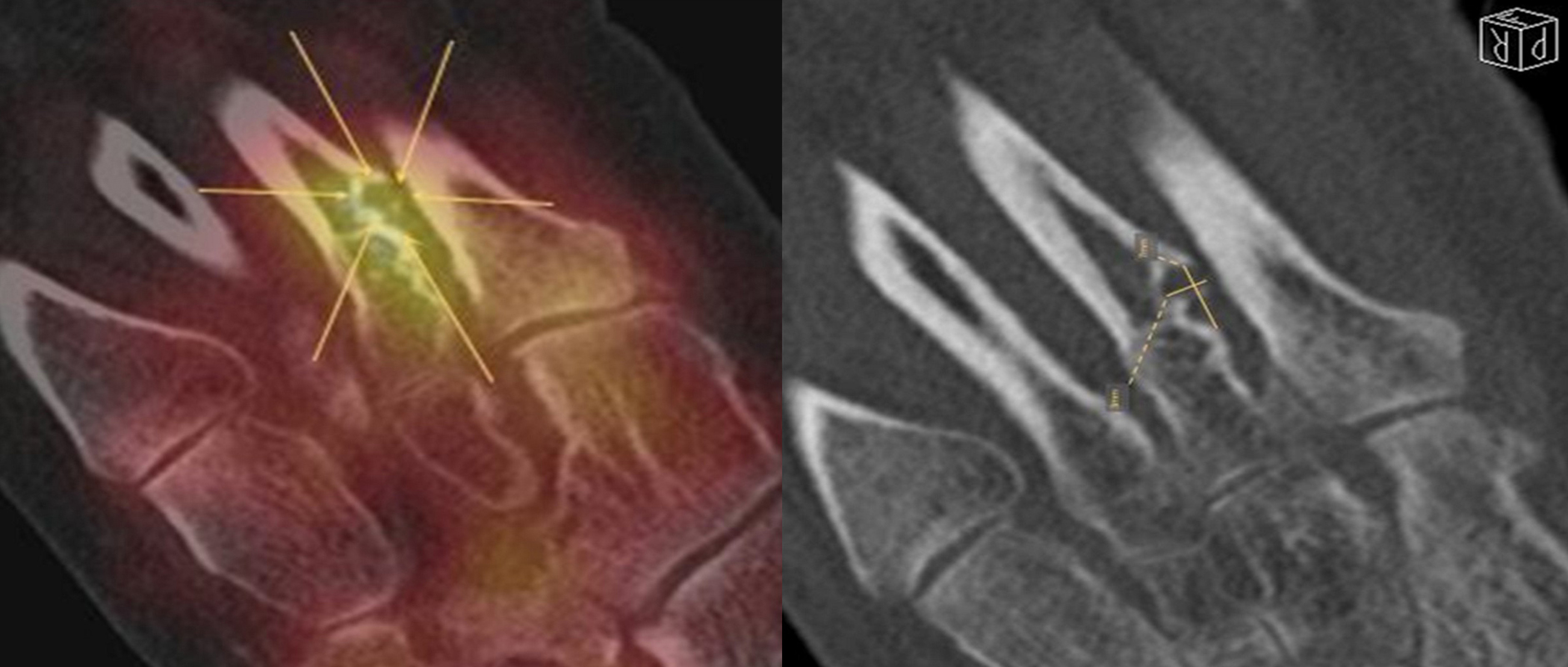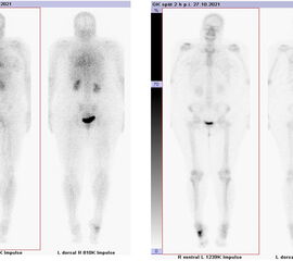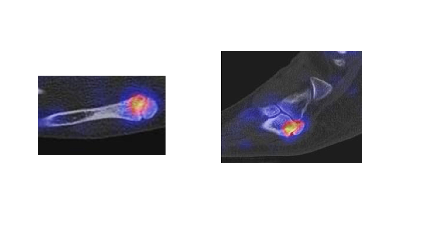 - Fokale oder flächige Mehranreicherungen in angrenzenden Gelenken in Verbindung mit arthrotischen Veränderungen im CT → V. a. symptomatische Arthrose