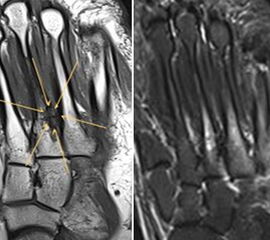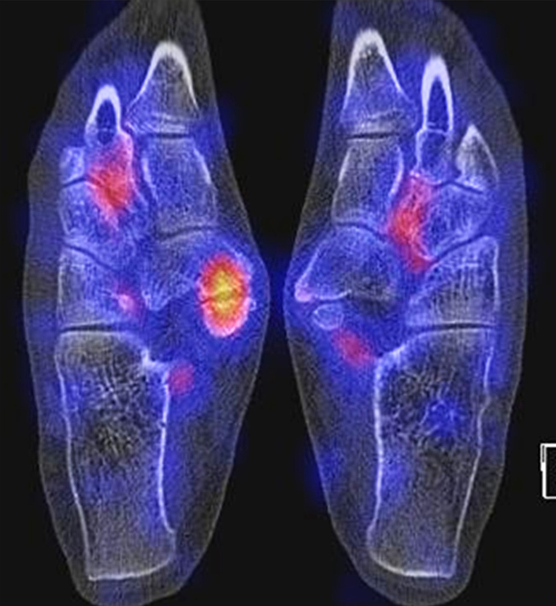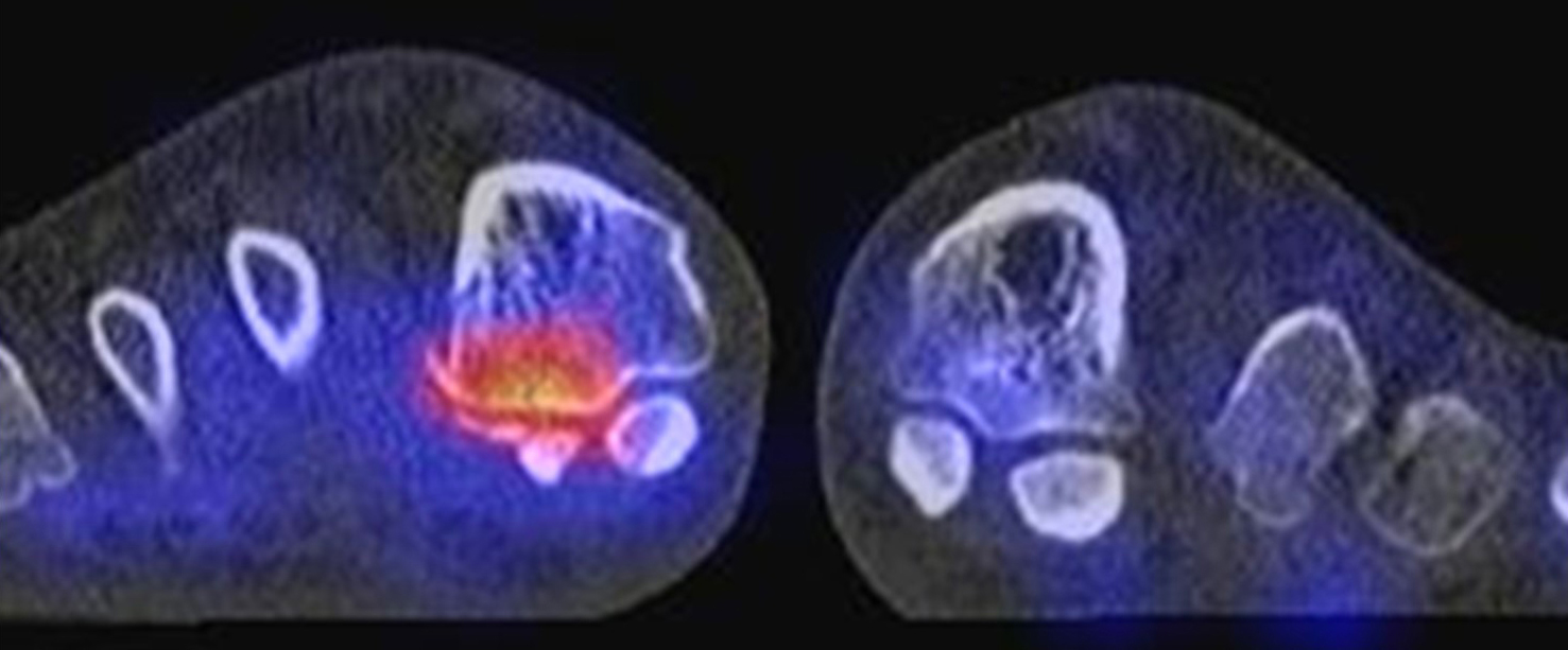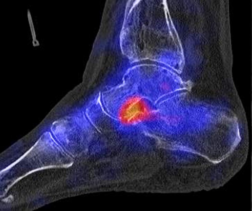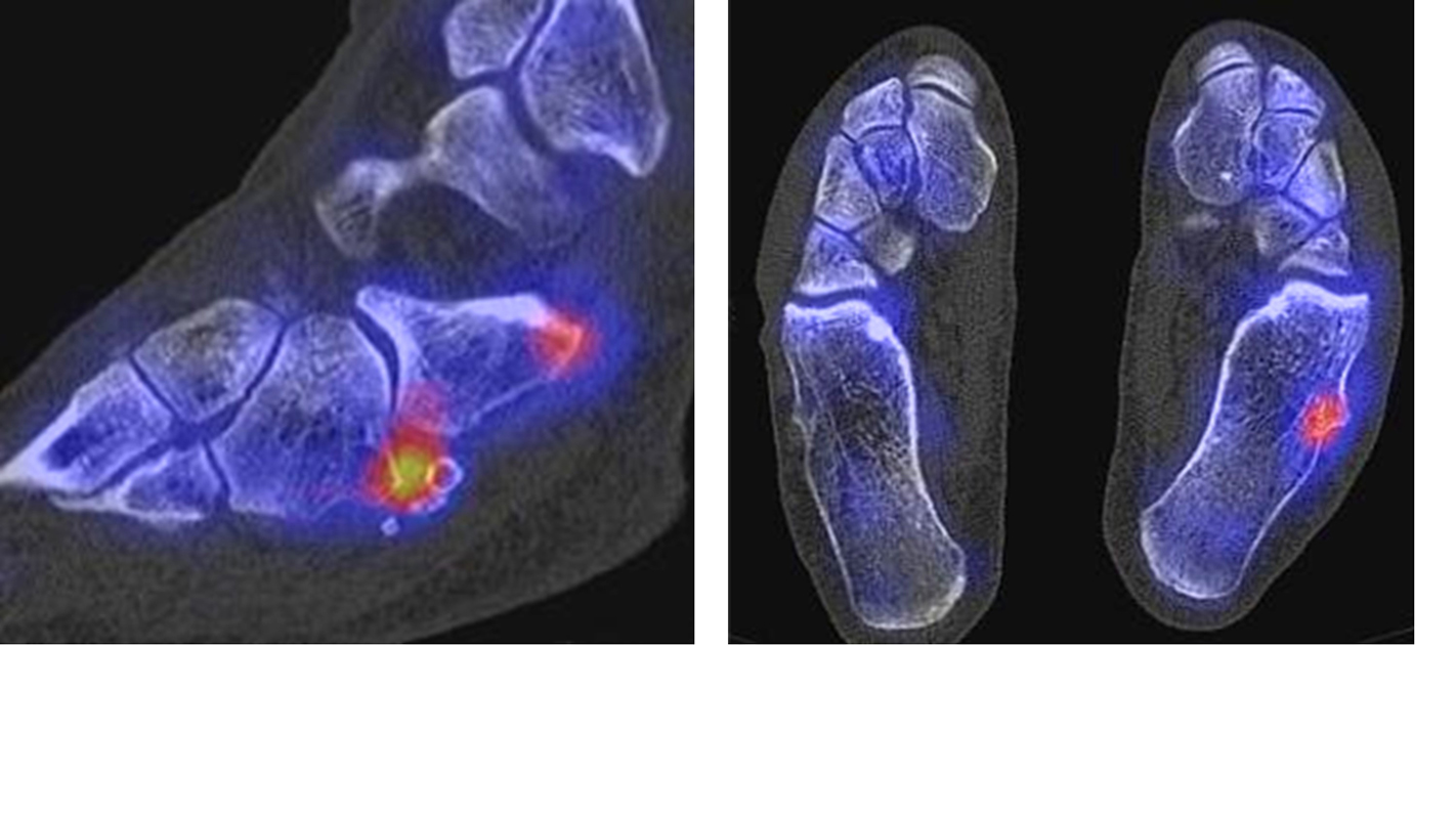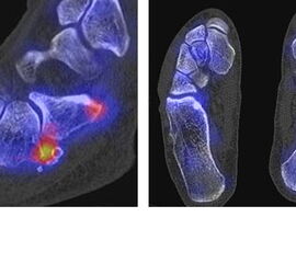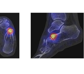 Die enge anatomische Beziehung der Mittel- und Rückfuß-Gelenke bei gehäuft nur subtilen morphologischen Veränderungen, die jedoch Schmerzen verursachen können, kann mit Hilfe der SPECT/CT übersichtlich differenziert werden.