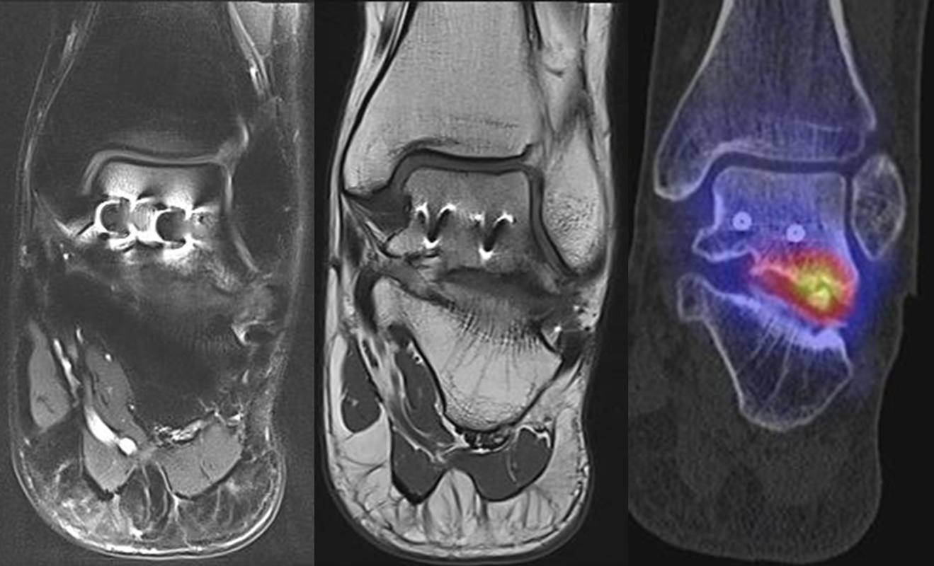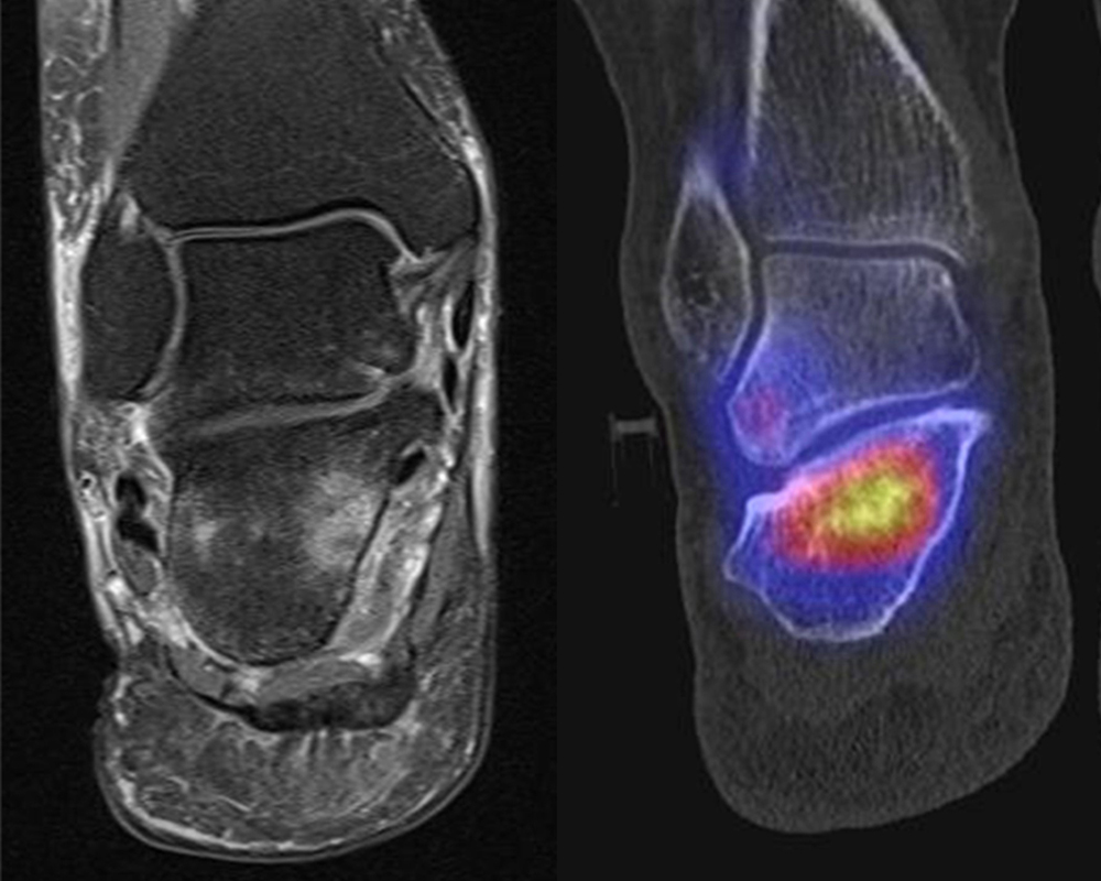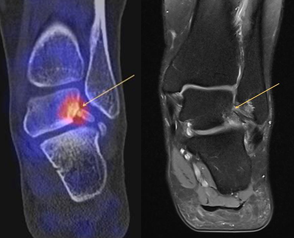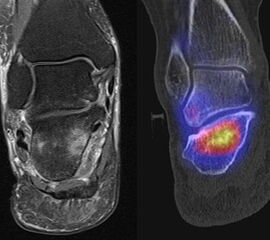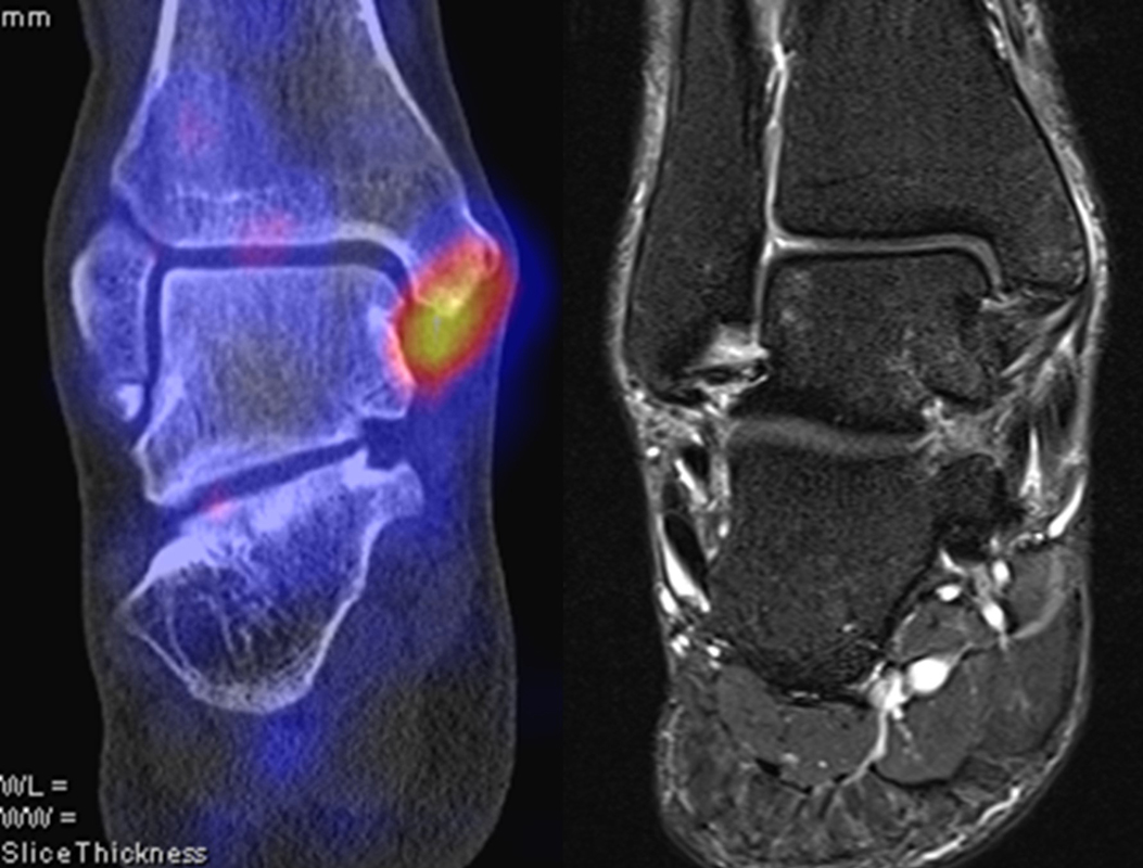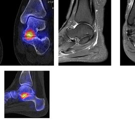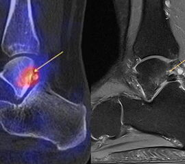 Eine Studie an 37 Patienten verglich direkt den diagnostischen Nutzen der MRT und SPECT/CT bei Knöchel- und Fußschmerzen mit unklarer Schmerzursache. Retrospektiv wurden Daten von Patienten mit Knöchel- oder Fußschmerzen analysiert, die sowohl eine MRT als auch eine SPECT/CT erhalten hatten. Läsionen und wahrscheinliche Schmerz-erzeugende Foci wurden jeweils im MRT- und im SPECT/CT registriert, klinisch korreliert, entsprechend behandelt und nachuntersucht. Bei den Patienten, bei denen eine signifikante Verbesserung auf die Therapie eintrat, wurde angenommen, dass die Diagnose unter Berücksichtigung der Bildgebung richtig gestellt wurde. Das Spektrum umfasste Weichteilläsionen (Bänder/Sehnen), Gelenk-Läsionen (Arthritis, Arthrose) und Knochenläsionen (Frakturen/Osteomyelitis/osteochondrale Läsionen). Insgesamt hatte die MRT eine Sensitivität, Spezifität, positiven Vorhersagewert und negativen Vorhersagewert von 82 %, 31 %, 74 % bzw. 42 %, und die SPECT/CT von 84 %, 60 %, 84 % und 60 % bzw. Der mittlere FADI-Score (Foot and Ankle Disability Index) für alle Patienten lag prätherapeutisch bei 61,5 (SD = 13,8) und posttherapeutisch bei 88,4 (SD = 13,01)(p < 0,05), was darauf hindeutet, dass die endgültige Bildgebungs-unterstützte Diagnose korrekt war. Insgesamt wurde bei 26 % der Patienten eine Therapieänderung aufgrund der höheren Spezifität der SPECT/CT-Befunde gegenüber der alleinigen MRT-Befunde beobachtet. Vor allem bei Knochenläsionen erwies sich die SPECT/CT als vorteilhaft, jedoch nicht bei Weichteilläsionen 72.
