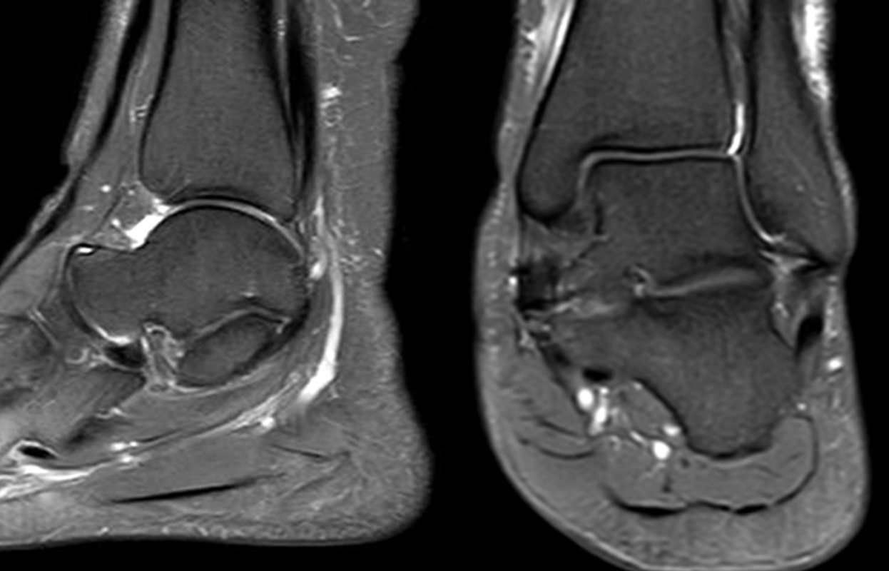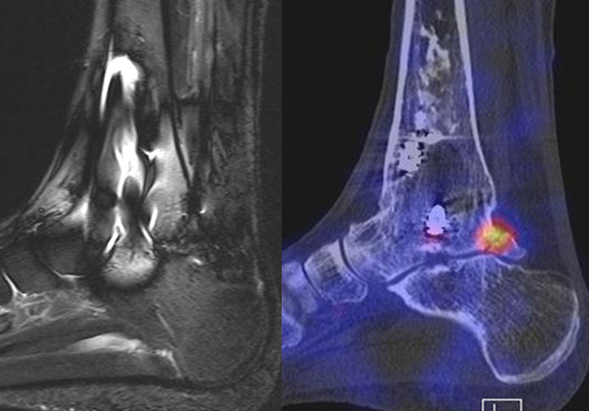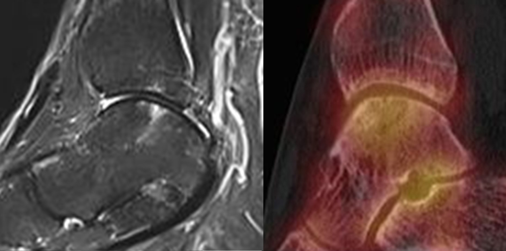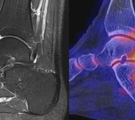 Eine Studie an 37 Patienten verglich direkt den diagnostischen Nutzen der MRT und SPECT/CT bei Knöchel- und Fußschmerzen mit unklarer Schmerzursache. Retrospektiv wurden Daten von Patienten mit Knöchel- oder Fußschmerzen analysiert, die sowohl eine MRT als auch eine SPECT/CT erhalten hatten. Läsionen und wahrscheinliche Schmerz-erzeugende Foci wurden jeweils im MRT- und im SPECT/CT registriert, klinisch korreliert, entsprechend behandelt und nachuntersucht. Bei den Patienten, bei denen eine signifikante Verbesserung auf die Therapie eintrat, wurde angenommen, dass die Diagnose unter Berücksichtigung der Bildgebung richtig gestellt wurde. Das Spektrum umfasste Weichteilläsionen (Bänder/Sehnen), Gelenk-Läsionen (Arthritis, Arthrose) und Knochenläsionen (Frakturen/Osteomyelitis/osteochondrale Läsionen). Insgesamt hatte die MRT eine Sensitivität, Spezifität, positiven Vorhersagewert und negativen Vorhersagewert von 82 %, 31 %, 74 % bzw. 42 %, und die SPECT/CT von 84 %, 60 %, 84 % und 60 % bzw. Der mittlere FADI-Score (Foot and Ankle Disability Index) für alle Patienten lag prätherapeutisch bei 61,5 (SD = 13,8) und posttherapeutisch bei 88,4 (SD = 13,01)(p < 0,05), was darauf hindeutet, dass die endgültige Bildgebungs-unterstützte Diagnose korrekt war. Insgesamt wurde bei 26 % der Patienten eine Therapieänderung aufgrund der höheren Spezifität der SPECT/CT-Befunde gegenüber der alleinigen MRT-Befunde beobachtet. Vor allem bei Knochenläsionen erwies sich die SPECT/CT als vorteilhaft, jedoch nicht bei Weichteilläsionen 72.