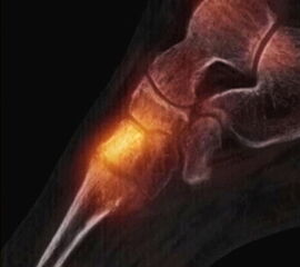 Beispiel für eine symptomatische Arthrose im Gelenk zwischen lateralem Sesambein und Köpfchen von Os metatarsale I.