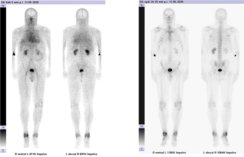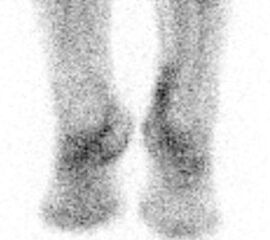 Interessanterweise scheint die diagnostische Aussagekraft bzw. Treffsicherheit der Granulozyten-Szintigraphie weitgehend unabhängig von einer gegebenenfalls erfolgten oder laufenden Antibiotikatherapie zu sein, sodass auch kleinere Entzündungsherde unter diesen Umständen nachgewiesen werden können 64. Zum Nachweis einer Osteomyelitis können neben dem aufwändigen Goldstandard mit in vitro markierten Granulozyten auch markierte Antigranulozyten-Antikörper verwendet werden 65. Ein Beispiel für eine Charcot-Arthropathie ist in Abbildung 7.1. dargestellt.