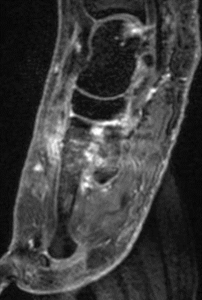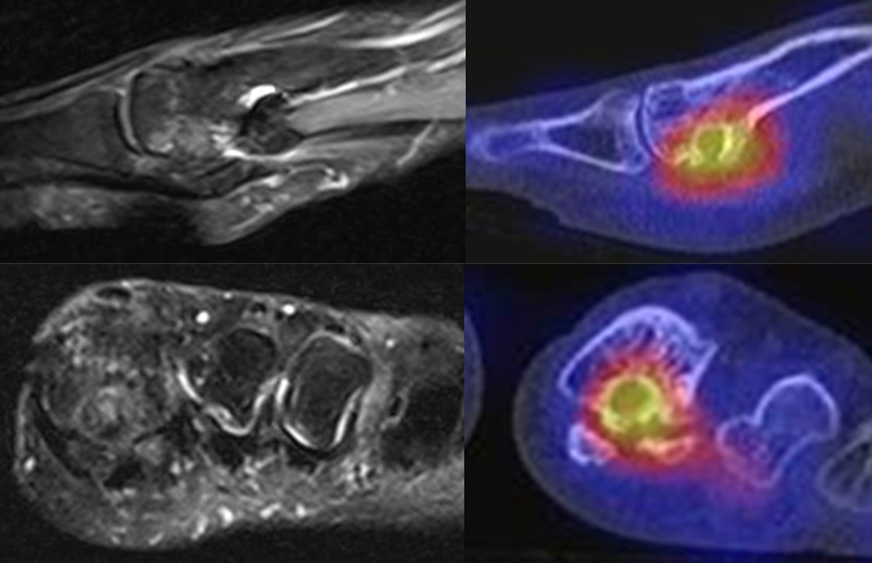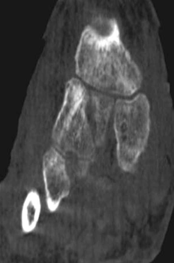 Bei der Diagnostik von Osteomyelitiden stellt die SPECT/CT ein wertvolles Tool dar. Prinzipiell kann durch die Kombination mit einer dünnschichtigen CT neben der Entzündungs-bedingten Knochenstoffwechsel-Steigerung die Röntgen-Pathoanatomie einer Entzündung detailliert dargestellt werden. Ein Beispiel für eine tarso-metatarsale Osteomyelitis in Kombination mit Arthritis liefert die Abbildung 1.5., hier finden sich sowohl typische Röntgenzeichen einer Osteomyelitis wie eine deutliche regionale Osteoporose/Osteopenie der beteiligten Knochen und die Arrosion der subchondralen Grenzlamellen im Rahmen der Arthritis.