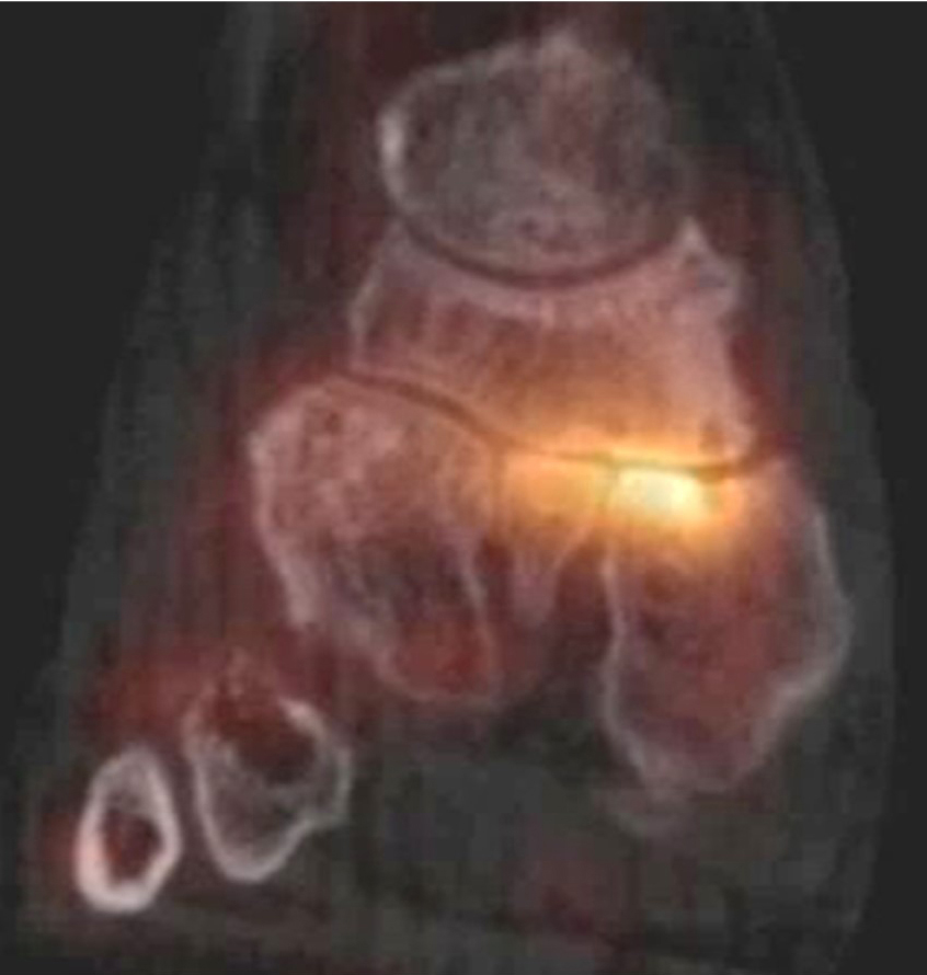 Kim et. al. beschreiben den Fall eines 18-jährigen Patienten mit einem symptomatischen hypermetabolen Os vesalianum 40. Ein vergleichbarer Fall ist in Abbildung 3.8. zu sehen. Die Patientin hatte persistierende Schmerzen lateral am rechten Fuß bei Zustand nach Distorsion vor 9 Monaten. Neben der Bestätigung des Verdachtes auf ein symptomatisches Os vesalianum, sollte auch die Differenzialdiagnose einer knöchernen Absprengung an der Basis MFK 5 geklärt bzw. ausgeschlossen werden.