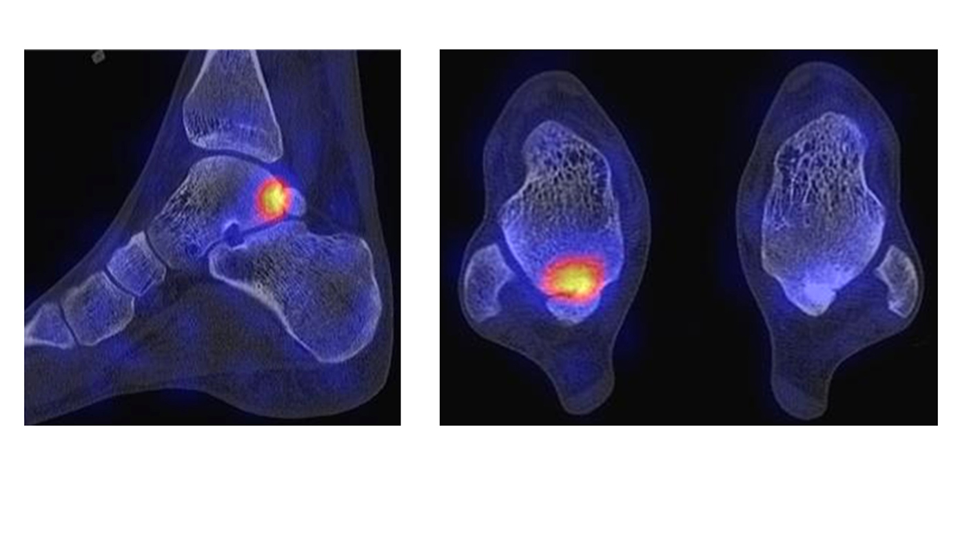 Zahlreiche Erkrankungen des Fußes bzw. der Sprunggelenke können treffsicher (> 90 %) mit Hilfe der SPECT/CT im Hinblick auf ihre klinische Relevanz diagnostiziert werden: exemplarisch insbesondere Fußwurzelarthrosen, Osteochondrale Läsionen, Sprunggelenk-Impingement, Coalitionen, Stressfrakturen, Sesambein-Pathologien, knöcherne Akzessoria, Arthrodesen-Komplikationen, Prothesen-Komplikationen, Arthritiden, Osteomyelitis, Diabetischer Fuß, Knochen-Nekrosen und Sehnen- bzw. Band-Pathologien.