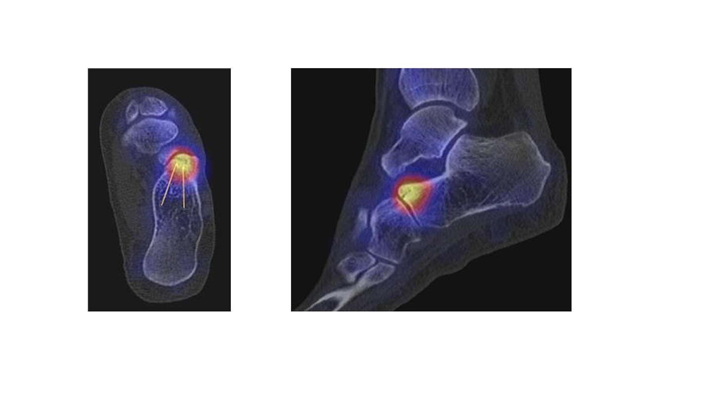 Zahlreiche Erkrankungen des Fußes bzw. der Sprunggelenke können treffsicher (> 90 %) mit Hilfe der SPECT/CT im Hinblick auf ihre klinische Relevanz diagnostiziert werden: exemplarisch insbesondere Fußwurzelarthrosen, Osteochondrale Läsionen, Sprunggelenk-Impingement, Coalitionen, Stressfrakturen, Sesambein-Pathologien, knöcherne Akzessoria, Arthrodesen-Komplikationen, Prothesen-Komplikationen, Arthritiden, Osteomyelitis, Diabetischer Fuß, Knochen-Nekrosen und Sehnenpathologien.
