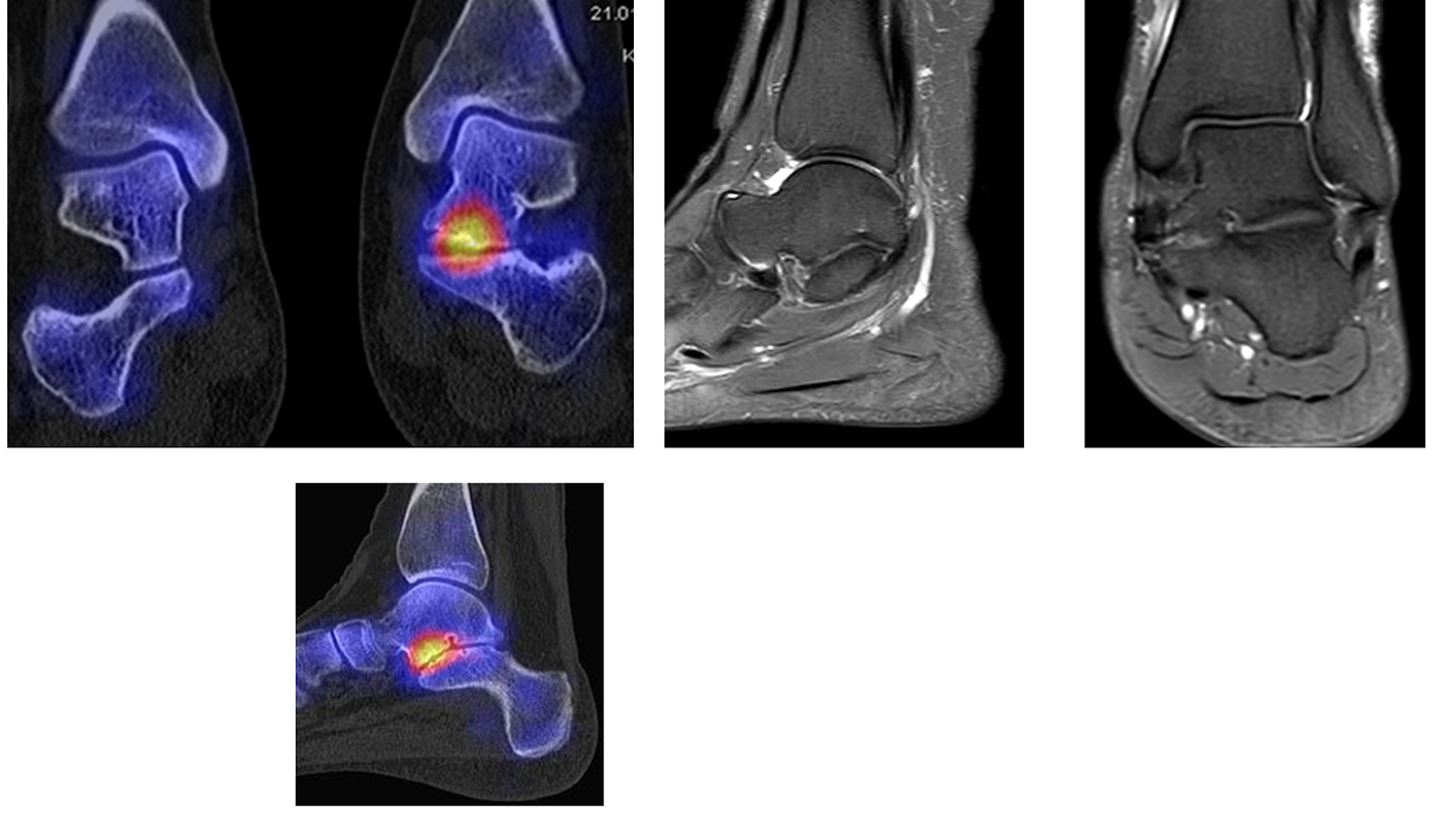 Bilder eines Patienten mit Z. n. mehrfachen Sprunggelenksdistorsionen in der Vergangenheit, besonders heftige Distorsion des linken Sprunggelenkes 5 Wochen vor der Untersuchung. Die SPECT/CT zeigt eine instabile osteochondrale Läsion mit deutlicher Aktivierung.