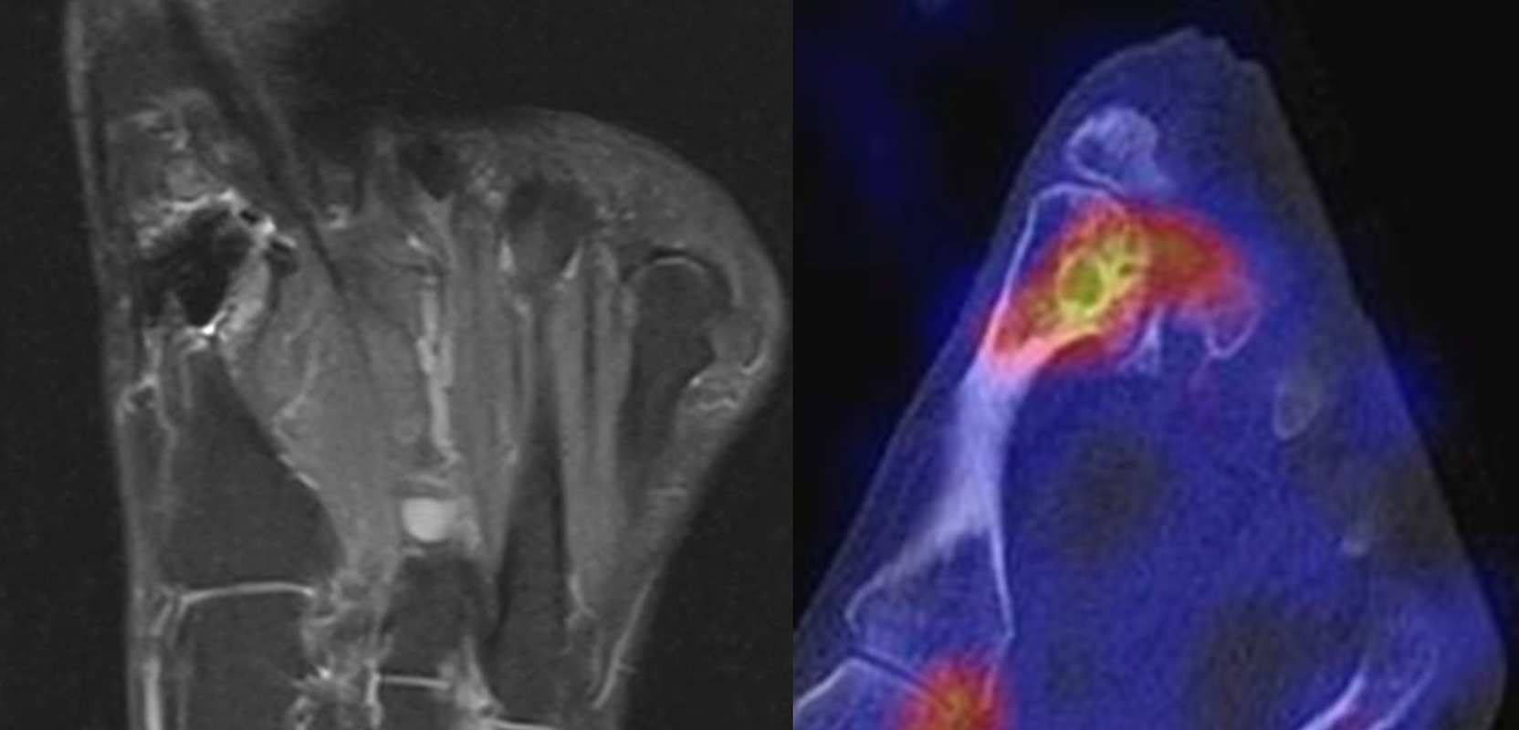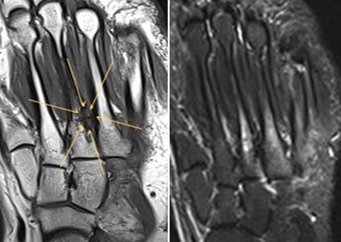 Es gibt bis dato mehrere Studien mit einem direkten Vergleich von SPECT/CT- und MRT-Befunden zur Erkennung von Fuß- und Sprunggelenksschmerz-Ursachen. Alle Studien, die die Diagnostische Performance der SPECT/CT direkt mit der MRT verglichen haben, weisen auf den hohen Stellenwert der SPECT/CT hin, da mit dieser Methode nicht nur mehr relevante Befunde gesehen, sondern auch symptomatische Läsionen eindeutiger festgestellt werden können. Bei der MRT-Diagnostik kann ein Knochenmarködem einen pathologischen Prozess anzeigen, wobei Knochenmark-Hyperintensitäten in T2-, STIR- bzw. Protonen-Dichte-gewichteten Sequenzen nur bedingt spezifisch sind und eine fokale Stressreaktion als Schmerzursache nicht so zuverlässig anzeigen können wie die Knochenszintigraphie 6644.
