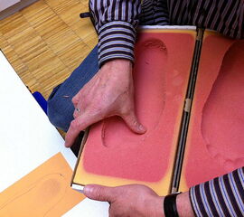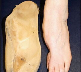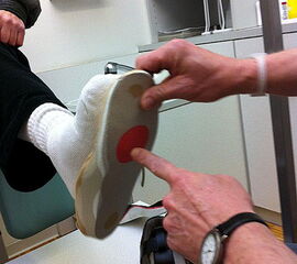 - Danach wird eine Sohle aufgeschäumt, in die ein Rollabsatz sowie eine Mittelfußrolle eingeschliffen werden. Mit dieser Maßnahme ist der Patient mobil und die gefährdeten Stellen des Fußes sind durch die Fußbettung teilentlastet. Hierdurch sind die besten Voraussetzungen für die Heilung eines Ulkus oder Malum perforans gegeben.