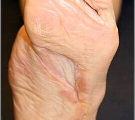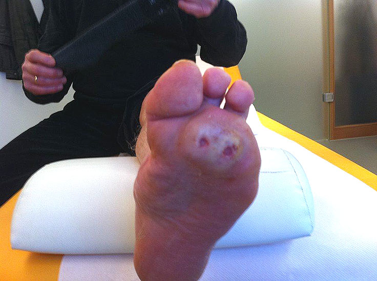 Durch den erhöhten Druck finden sich Hornhautverschwielungen an den mechanisch stark belasteten Stellen der Fußsohle und den Zehen. Die Hornhautschwielen, die immer bakteriell infiziert sind, gleichzeitig aufgrund der reduzierten Elastizität der Haut zu Rissen und damit Eintrittspforten führen, sind Ausgangspunkte diabetischer Ulzera.