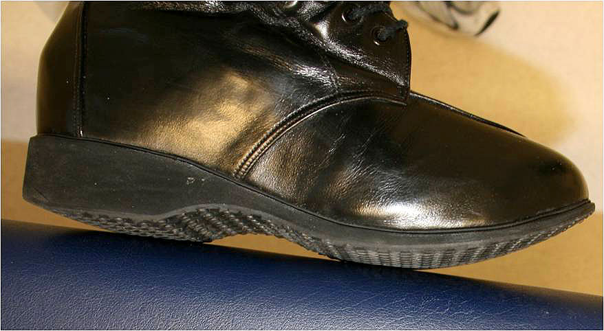 Zusätzlich zur Versorgung mit dem oben beschriebenen Konfektionsschuh, muss in diesem Fall auf die speziellen Fußdeformitäten eingegangen werden. Hierzu wird der Konfektionsschuh orthopädieschuhtechnisch zugerichtet und gegebenenfalls mit bettenden Einlagen meist aus Weichschaummaterialien versorgt (Abb. 8). Bei Achsabweichungen in der unteren Extremität (z.B. Genu varum oder valgum) kann der Lotaufbau durch eine Verbreiterung des Absatzes und/oder einen Flügelabsatz verändert werden. Weitere Möglichkeiten sind ein Puffer- oder Rollabsatz, um durch eine Verkürzung des hinteren Hebels die Kräfte, die auf den Rückfuß einwirken zu vermindern. Zur Reduktion der auf den Vorfuß wirkenden Kräfte können Abrollhilfen (Ballen- oder Mittelfußrolle) eingesetzt werden. Diese wirken über eine Verkürzung des vorderen Hebelarmes. Ein klassisches Einsatzgebiet sind Druckspitzen unter den Metatarsaleköpfchen. Bei Deformitäten am medialen oder lateralen Fußrand, bzw. am Fußrücken besteht die Möglichkeit durch Aussparungen und Polsterungen des Schuhschaftes diesen der Fußdeformität anzupassen.