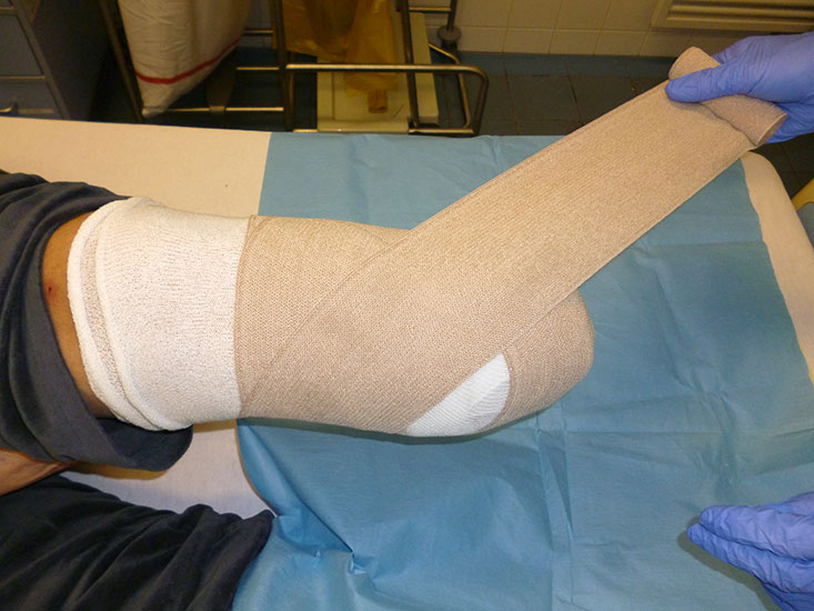 Bei Amputationen im distalen bis mittleren Fuß erfolgt die Entlastung im Verbandsschuh bis zur Wundheilung. Je weiter proximal die Amputation gelegen ist, umso länger muss entlastet werden. Mit Kompressionsverbänden (Abb. 13) und ruhigstellenden Hartverbänden (Cast) kann man das Risiko einer Nachblutung verringern. Vorsicht ist bei PAVK geboten, da die Kompression Nekrosen hervorrufen kann. Drainagen werden bis zum Sistieren der Sekretion belassen.