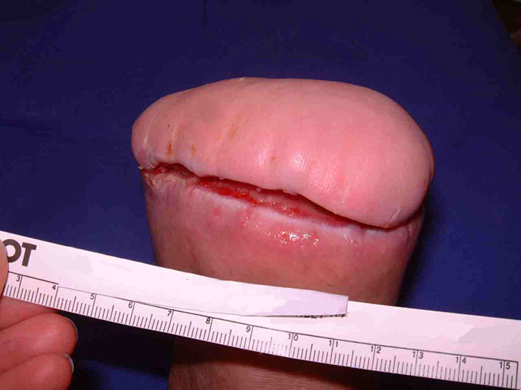 Wenn bei flächenhafter Blutung oder bei unvollständig sanierter Infektion die Wunde verschlossen wird, ist eine Wundheilungsstörung vorprogrammiert. Es ist jedoch möglich, im Infektbereich zu amputieren, wenn das verbleibende Gewebe eine gute Vitalität aufweist. Die Sanierung der Infektion erfolgt dann durch regelmäßiges Debridement und Antibiotikatherapie. Wir haben den Eindruck, dass ein Unterdruckverband die Infektheilung unterstützen kann. Dieses konnte jedoch bislang nicht wissenschaftlich untermauert werden. Die Wirksamkeit des Unterdruckverbands zur Wundkonditionierung gilt als sicher 6.