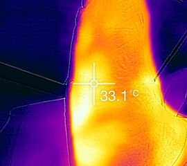 Ziel der Palpation des Fußes ist das Erfassen pathologisch veränderter Strukturen und deren Zuordnung zu einem anatomischen Korrelat sowie die Suche nach evtl. Schmerzpunkten. Aufgrund der Neuropathie die Aussagekraft des Parameters „Schmerz“ beim DFS begrenzt. Häufig besteht eine Druckschmerzhaftigkeit erst bei einer bis in tiefere Fußkompartimente reichenden Infektion. Die bei der Inspektion gefundenen kritischen Punkte mit lokal vermehrter Beschwielung werden abgetastet, um knöcherne Prominenzen nicht zu übersehen. Im Bereich entzündlicher Veränderungen der Haut dient die Palpation dem Auffinden eines möglichen subkutanen Flüssigkeitsverhaltes oder Gelenkergusses und von lokalen Temperaturdifferenzen. Da die Fähigkeit der manuellen Temperaturprüfung stark eingeschränkt, subjektiv und nicht reproduzierbar ist, hat sich eine Hautoberflächentemperaturmessung mittels Infrarotthermometer bewährt 12. Gerade beim Monitoring der akuten Osteoarthropathie ist damit durch seitenvergleichende Messung eine gute Korrelation zum Aktivitätsgrad der Entzündung herzustellen 1314 (EK III, HG A). Das beim DFS in der Regel atrophierte plantare Fettpolster, die oft verhärtete Plantarfaszie und die kritische Region der Mittelfußköpfchen sollten sorgfältig abgetastet werden.