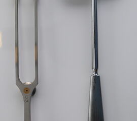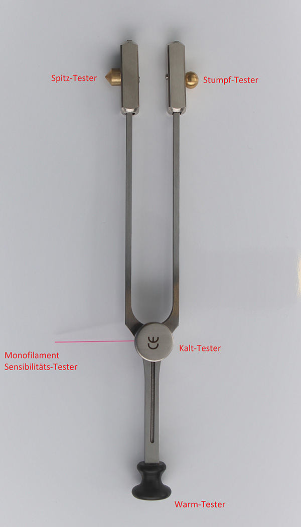 Falls angiologische und/oder neurologische Vorbefunde nicht vorliegen, sollte diesbezüglich zumindest eine Basisdiagnostik erfolgen. Die Pulse der A. tibialis posterior und A. dorsalis pedis werden getastet. Die Rekapillarisierungszeit im Bereich der Zehen wird beurteilt. Bei nicht tastbaren Fußpulsen sollte umgehend eine weitergehende angiologische Diagnostik eingeleitet werden. Dann sollten die Muskeleigenreflexe sowie das Schmerz-, Berührungs-, Temperatur- und Vibrationsempfinden im Bereich von Unterschenkel und Fuß zumindest grob geprüft werden. Einfache Hilfsmittel wie das 10g-Semmes-Weinstein-Monofilament, eine 128-Hz-Stimmgabel und ein TipTherm® sind dabei sehr nützlich.