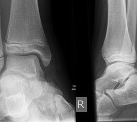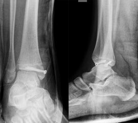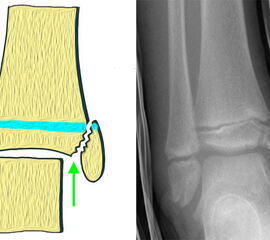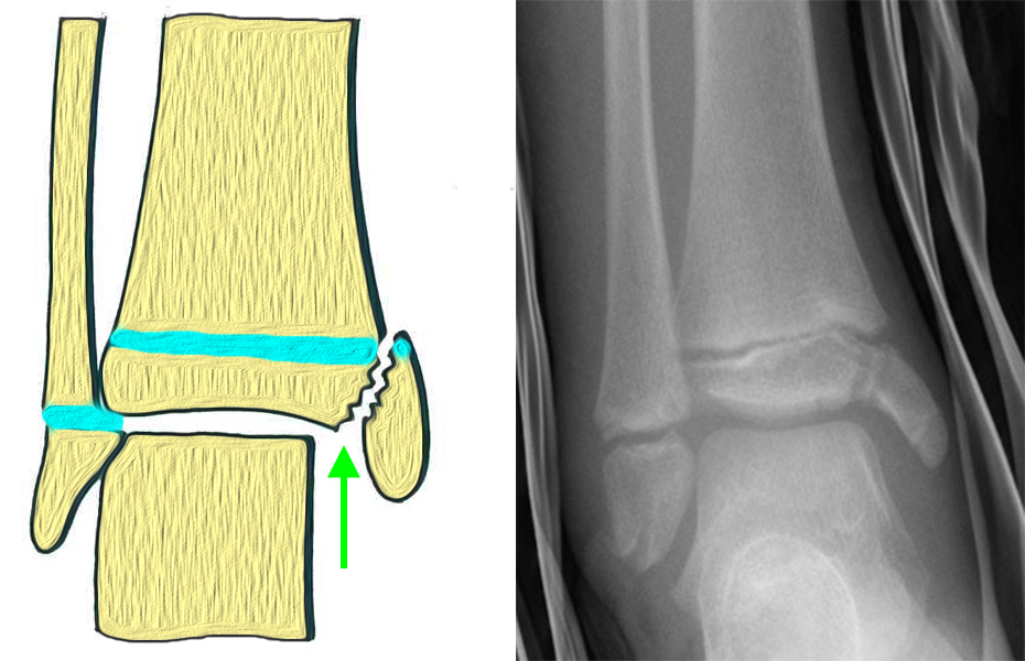 In Abhängigkeit vom Reifezustand der Wachstumsfuge kann der epiphysäre Frakturspalt sehr weit medial bis ganz lateral zu liegen kommen. Ein sehr weit lateral liegender Frakturspalt entspricht funktionell nahezu einem knöchernen Ausriss der vorderen Syndesmose, was sich im Röntgenbild an einer erweiterten Malleolengabel erkennen lässt 9.