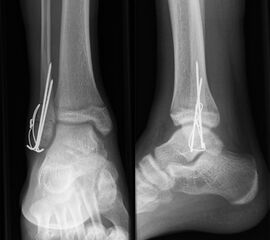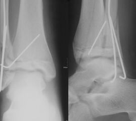 Findet sich eine Dislokation der Wachstumsfuge erfolgt nach Reposition eine K-Drahtspickung. Die postoperativ angelegte Gipsschale wird nach Abschwellung entfernt und ein Unterschenkelgips für 4 Wochen angelegt.