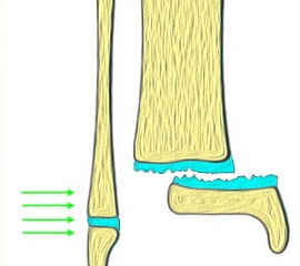 Übergangsfrakturen sind spezielle Verletzungen, die ausschließlich in der Lebensphase beobachtet werden, in welcher die Wachstumsfugen teilweise geschlossen sind. Die Wachstumsfuge an der distalen Tibia schließt sich von ventromedial beginnend nach dorsal und lateral. Während die bereits geschlossene Wachstumsfuge eine hohe Stabilität aufweist, ist der knorpelige Anteil der noch offenen Fuge wesentlich weniger widerstandsfähig. Die mechanisch schwächste Schicht der Wachstumsfuge ist der Blasenknorpel. Durch Biege- und Scherkräfte kommt es zu einer Verletzung der Wachstumsfuge mit Aussprengung eines metaphysären Keils. Übergangsfrakturen sind „unvollendete“ Fugenschaftfrakturen bei welchen die bereits geschlossene Fuge ein Auslaufen der Frakturlinie durch die Fuge verhindert und daher die Bruchlinie ins Gelenk ausläuft (v. Laer 2013).