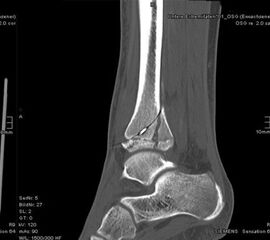 Der teilweise komplexe Frakturverlauf bei Übergangsfrakturen lässt sich im CT zuverlässig darstellen 10. Der erfahrene Untersucher kann bereits mit Röntgenaufnahmen des Sprunggelenks in zwei Ebenen in Verbindung mit zwei 45° Schrägaufnahmen sehr umfassende Aussagen zum Frakturverlauf treffen (v. Laer 2013), die Präzision und Aussagekraft der Computertomografie ist aber zweifelsohne überlegen und wird von den meisten Behandlern bevorzugt 11, auch wenn sich zu diesem Thema in der Literatur eine teilweise sehr emotional geführte Diskussion findet. Einigkeit hinsichtlich der Indikation für ein Schnittbildverfahren besteht bei Triplane-Frakturen, wenn Zweifel darüber bestehen, inwieweit die metaphysäre Fraktur den tragenden Gelenkanteil tangiert 12.
