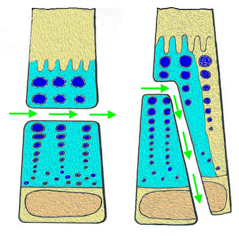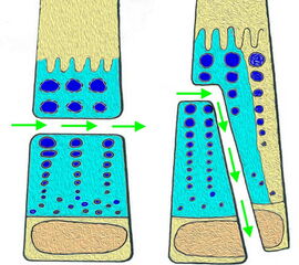 Allerdings bietet der zelluläre Anteil der Epiphysenfuge einen geringeren Widerstand gegenüber Scher-und Biegungskräften. Der wachstumsaktive, epiphysäre Teil der Fuge wird bei der Fugenschaftfraktur allenfalls geringfügig geschädigt, da der Frakturverlauf die wachstumsaktive Zellschicht nicht tangiert (Aitken I, Fugenschaftfraktur).