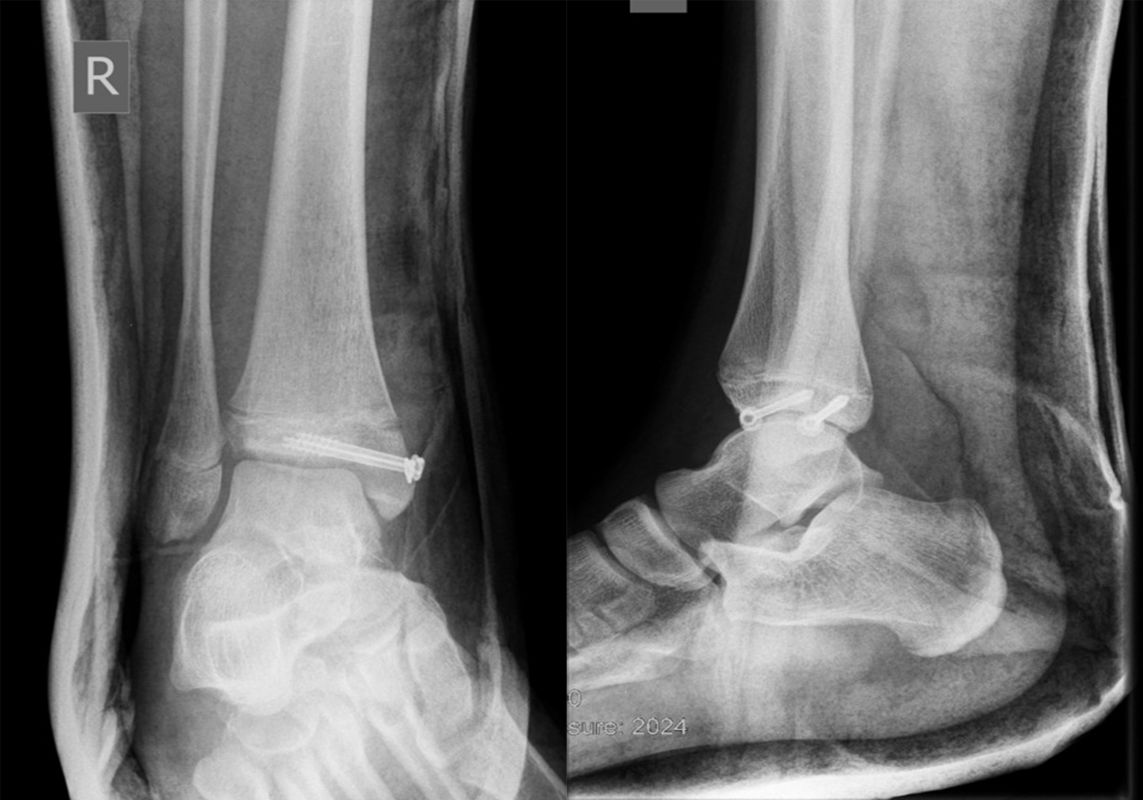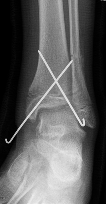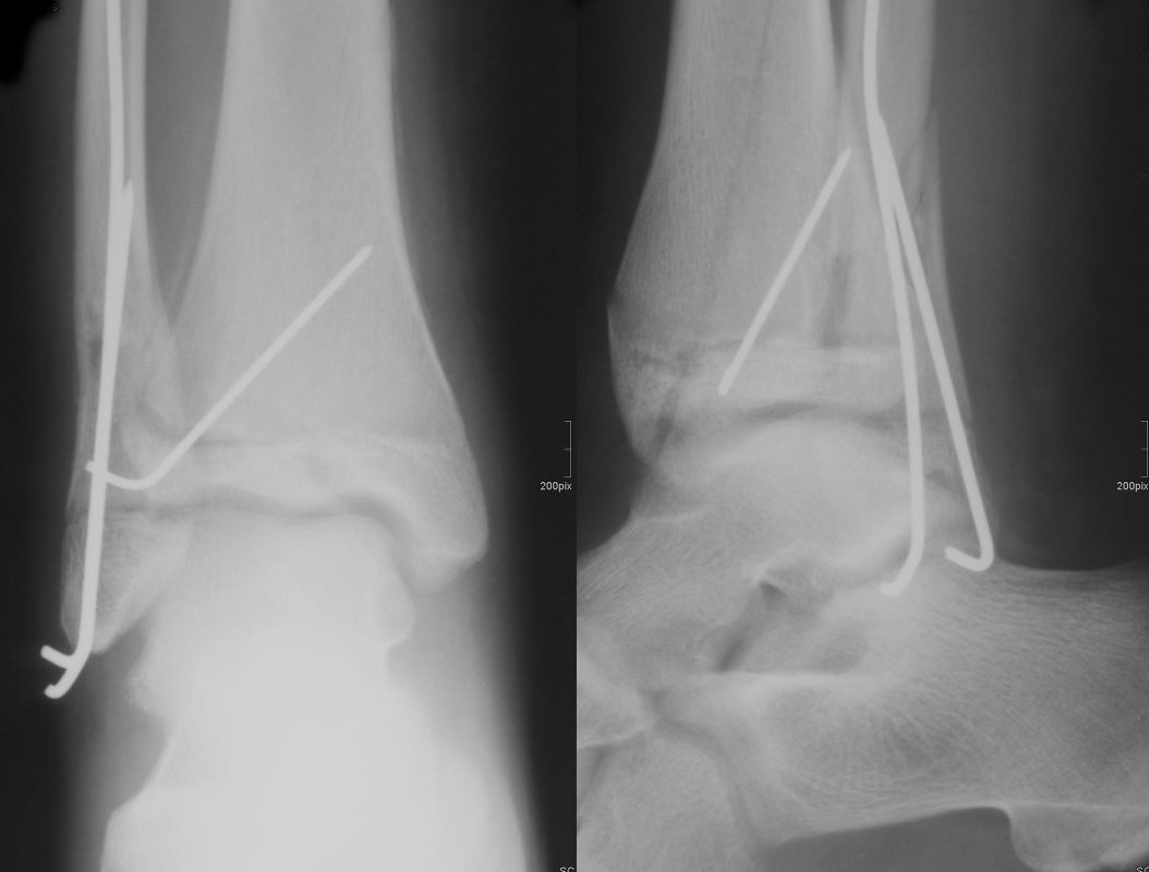 Nach Gipsabnahme können die Drähte entfernt und das Sprunggelenk zunehmend aufbelastet werden.
