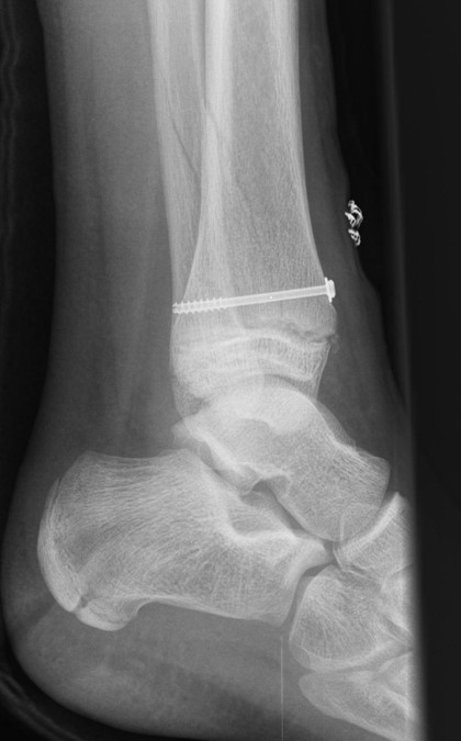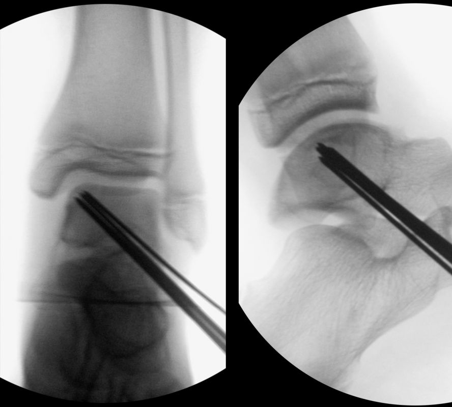 Dislozierte Frakturen (Frakturspalt > 2 mm) werden grundsätzlich operativ behandelt. Die Reposition kann arthroskopisch unterstützt erfolgen. Die Schraubenosteosynthese erfolgt entsprechend dem Frakturverlauf. Bei Twoplain Frakturen ist meist eine epiphysäre Schraube ausreichend die von lateral kommend das Fragment nach medial-proximal fixiert. Der Schraubenverlauf ist üblicherweise von lateral ventral nach proximal dorsal medial (Abb. 24). Nach Reposition darf in der seitlichen Aufnahme des Sprunggelenks, als auch in der 45° Außenrotationsaufnahme keine Stufe in Höhe der Wachstumsfuge erkennbar sein. Eine sichtbare Stufe ist Indikator für eine unzureichende Reposition.