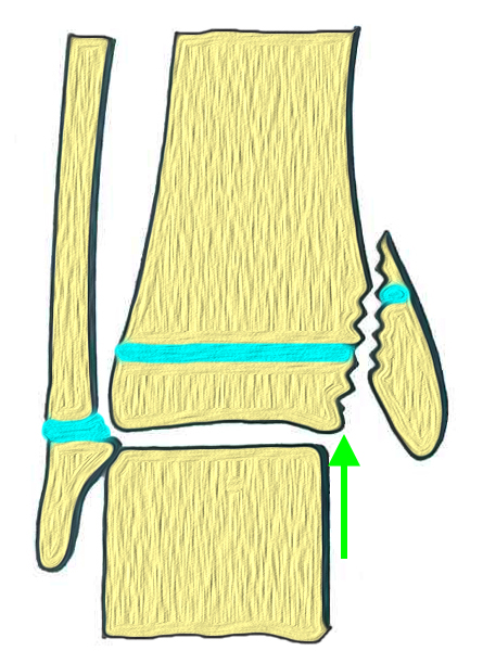 - Triplane-I-Fraktur: Epiphysäre Fraktur, mit teilweisem Verlauf durch die Wachstumsfuge und gleichzeitigem metaphysären Keil.