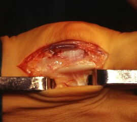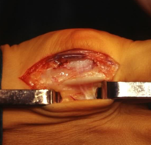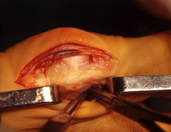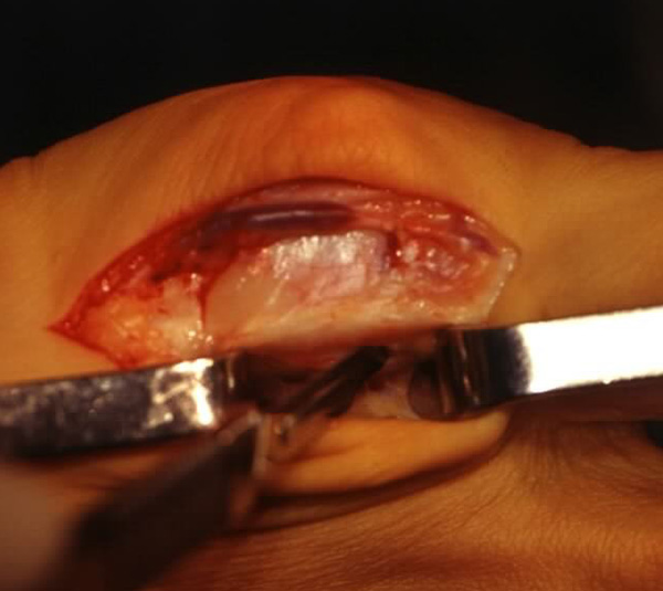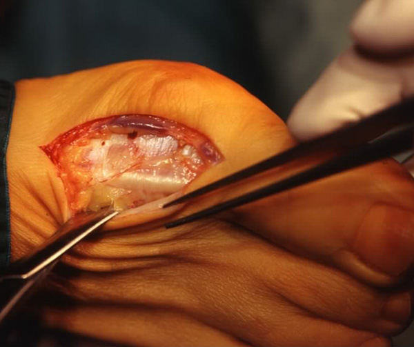 Die laterale Gelenkskapsel wird dargestellt, das in der Tiefe gelegene Lig. intermetatarseum transversum prof. wird auf jeden Fall geschont. Durch Manipulation der Großzehe in Extension und Flexion kann der Gelenkspalt von außen identifiziert werden, die Gelenkskapsel wird nun unter querer Durchtrennung des Lig. collaterale lat. eröffnet: die Inzision reicht dorsalseitig vom lateralen Rand des M. ext. hall. brev. nach plantar bis zum lateralen Rand des Lig. sesamophalangeale lat. Eine rechtwinklige Präparierklemme wird in das Gelenk unter das Lig. metatarsosesamoidale lat. eingeführt und damit das Lig. metatarsosesamoidale lat. ohne Gefahr einer Gefäßläsion komplett durchtrennt.
