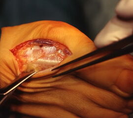 bei Zugang über eine einzelne dorsomedial gelegene Hautinzision (Abbildung 3) wird stumpf mit Scherenschlägen direkt über den Strecksehnen nach lateral, und lateral der Strecksehnen nach intermetatarsal präpariert (Abbildung 4). Mit je einem Scherenschlag distal und einem proximal des Gelenkspaltes wird Platz für 2 Haken geschaffen, wobei sich Farabeuf-Haken bewährt haben (Abbildung 5). Dabei wird das subcutane Gewebe komplett nach lateral verschoben, was im Gegensatz zum Zugang über einen eigenen intermetatarsalen Hautschnitt eine deutlich bessere Übersicht über den ersten Intermetatarsal-Raum gibt. Die laterale Gelenkskapsel wird dargestellt, das in der Tiefe gelegene Lig. intermetatarseum transversum prof. wird auf jeden Fall geschont (Abbildung 6). Durch Manipulation der Großzehe in Extension und Flexion kann der Gelenkspalt von außen identifiziert werden, die Gelenkskapsel wird nun unter querer Durchtrennung des Lig. collaterale lat. eröffnet (Video 3): die Inzision reicht dorsalseitig vom lateralen Rand des M. ext. hall. brev. nach plantar bis zum lateralen Rand des Lig. sesamophalangeale lat. (Abbildungen 7 und 8). Nun wird versucht, durch die Inzision eine rechtwinklige Präparierklemme in das Gelenk unter das Lig. metatarsosesamoidale lat. einzuführen (Abbildungen 9 und 10): wenn dies gelingt, kann direkt über der Präparierklemme das Lig. metatarsosesamoidale lat. ohne Gefahr einer Gefäßläsion komplett durchtrennt werden (Abbildungen 11 und 12). In Fällen stärkerer degenerativer Veränderungen oder postentzündlicher Verwachsungen gelingt das Einführen der Präparierklemme in das Gelenk meist nicht, in diesen Fällen muss das Lig. metatarsosesamoidale lat. unter Sicht von der Lateralseite des MTK-1 abgelöst werden. Das komplette laterale Release wird einerseits durch das lockere Einführen eines stumpfen Hohmann-Hebels zwischen Plantarseite des MTK-1 und Sesambeinkomplex geprüft, andererseits durch Varisierung der Großzehe. Gelingt dies nicht, so ist in erster Linie zu prüfen, ob das Lig. metatarsosesamoidale lat. komplett durchtrennt wurde, in zweiter Linie müssen alle anderen Strukturen, die eventuell im Einzelfall noch für eine laterale Kontraktur am Großzehengrundgelenk verantwortlich sein können, visuell und durch Nachtasten geprüft werden: Ansatz des M. adductor hallucis an der Basis der Grundphalanx, hochgradige Kontraktur des Lig. sesamophalangeale lat.