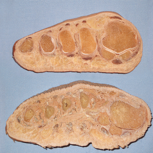 Während der Entwicklung der Hallux Valgus-Deformität gleitet das MTK-1 nach medial ab und verliert dabei seine Position auf den Sesambeinen (Abbildung 2). Dies führt zwangsläufig zu einer Elongation der medialen ligamentären und kapsulären Strukturen und in Folge zu einer Verkürzung der lateral gelegenen Weichteile. Die Verkürzung des Lig. metatarsosesamoidale lat. korrespondiert mit der so genannten „Sesambeinluxation“, die auf dorsoplantaren Röntgenbildern oder in anatomischen Querschnitten (Abbildung 2) sichtbar wird und gleichzeitig mit einer Elongation des Lig. metatarsosesamoidale mediale einhergeht.
