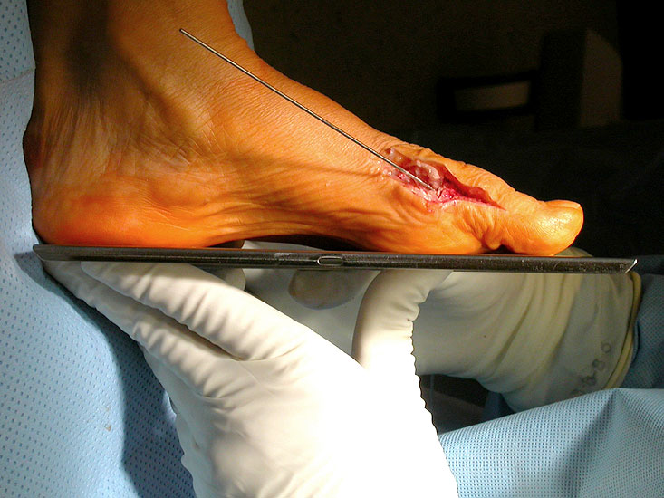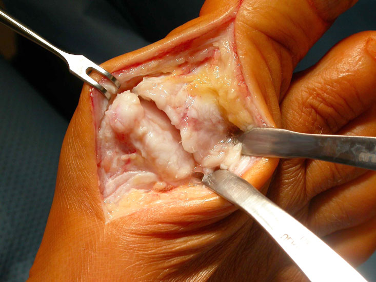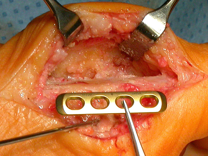 Der Zugang erfolgt längs dorsal am Großzehengrundgelenk, um die Gelenksflächen gut bearbeiten zu können. Das Extensorenretinakulum wird längs medial der Streckersehnen gespalten und die Sehnen nach lateral weggehalten. Dann wird die Kapsel längs eröffnet mit Entfernung der Osteophyten und Exposition der Basis des Grundgelenkes sowie des Metatarsalekopfes. Nun wird ein Führungskirschnerdraht eingebracht und die beiden Gelenksflächen gemäss der Dimension der proximalen Grundgliedbasis konisch gefräst. Dann erfolgt die Entnahme der ipsilateralen M. grazilis- oder M. semitendinosus-Sehne mit dem Sehnenstripper. Das Transplantat wird kugelförmig gerollt, vernäht und in die gefräste Knochenhöhle eingebracht. Anschließend wird das Transplantate an der Kapsel armiert und die Kapsel verschlossen. Bei ungenügender Stabilität der Großzehe kann ein temporärer Kirschnerdraht für 4 Wochen eingebracht werden.