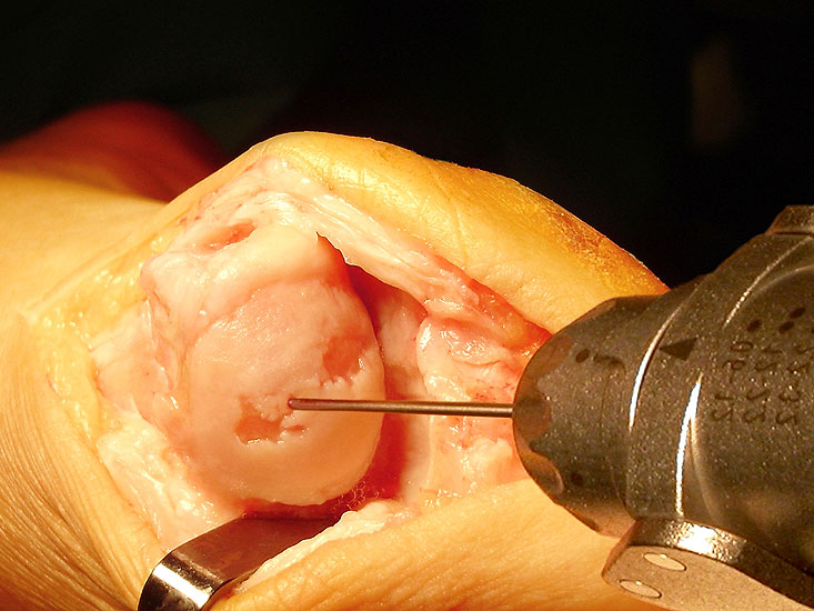 Der Zugang erfolgt medial zwischen dem dorsomedialen und plantomedialen Gefäß-Nerven-Bündel (internervous plane) mit Darstellung der Gelenkkapsel über eine longitudinale Inzision. Dann wird die Kapsel vorsichtig vom dorsalen Aspekt des Os metatarsale I und der Grundphalanx wegpräpariert, bis das ganze Gelenk eingesehen werden kann. Jetzt wird die Synovektomie und die Entfernung von freien Gelenkskörpern vorgenommen inklusive einer präliminären Entfernung der störenden Exostosen (zunächst ohne Gelenksanteile) mit der oszillierenden Säge für eine bessere Übersicht. Nun wird die Knorpelqualität an den Gelenksflächen und die Qualität der Sesamoidea durch manuelle Distraktion und Bewegung der Großzehe beurteilt. Für die Cheilektomie muss mindestens 50% des Restknorpels an den jeweiligen grossen Gelenksflächen erhalten sein 10. Die Menge des zu resezierenden Knochens am Metatarsalekopf richtet sich nach der Größe des Osteophyten und des Knorpelschadens. Mit einer schrägen Osteotomie wird mindestens 25% des dorsalen Metatarsalekopfes bis an die Knochen-Knorpelgrenze reseziert. Die Hauptbelastungszone des Kopfes (Apex) sollte erhalten bleiben. Bei Bedarf erfolgt die schräge Osteotomie auch auf Seiten der Großzehe. Kritische Knorpelzonen in der Hauptbelastungszone können via Pridiebohrungen angefrischt werden (Abb. 3). Wir verwenden hierfür einen Kirschnerdraht. Jetzt erfolgt die Weichteillyse des Rezessus zwischen den Sesamknöchelchen und dem plantaren Aspekt des Os metatarsale I mit einem Raspatorium oder Meißel. Hier zeigen sich oftmals Weichteilverklebungen, welche die passive Dorsalflexion behindern. Das Ziel ist eine intraoperativ erreichbare Dorsalflexion von etwa 60°.