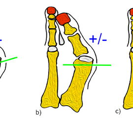 Häufig findet sich zusätzlich eine Hallux valgus interphalangeus Fehlstellung des Grundgliedes der ersten Zehe, so dass ergänzend eine Akin-Osteotomie sinnvoll sein kann 8. Durch eine monokortikale closing wedge Osteotomie können die Gelenkflächen korrigiert und die lange Beuge- und Strecksehne wieder zentriert werden (siehe Kapitel Akin Osteotomie).