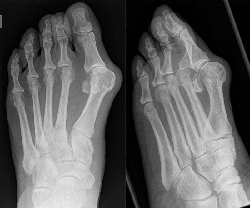 Der Hallux valgus ist durch einen vergrößerten Intermetatarsalwinkel mit dezentrierten Sesambeinen und valgischer Stellung der Großzehe charakterisiert. Oft kommt es zu Druckbeschwerden im Bereich des prominenten Metatarsale I Kopfes. Durch Verlagerung des Drehzentrums kommt es zu einer insuffizienten Kraftaufnahme des ersten Strahls 1, was zu einer Überbelastung der Metatarsale II und III Köpfe führen kann (Transfermetatarsalgie). Bei den meist weiblichen Patienten (Waizy 2015) kann es je nach Ausprägung der Großzehe zur Verdrängung der Kleinzehen und zu komplexen Vorfußfehlstellungen kommen 23.