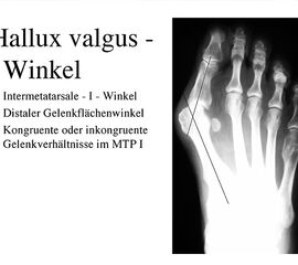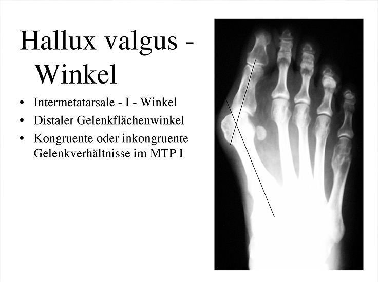 Die Indikationsstellung des geeigneten Operationsverfahrens erfolgt nach dem Schweregrad der Hallux valgus Deformität (Lehmann DE, 2003). Diese kann anhand verschiedener Winkelparameter graduiert werden, nämlich dem Hallux valgus Winkel, dem Intermetatasale – I – Winkel sowie dem distalen Gelenkflächenwinkel, der häufig auch als PASA-Winkel bezeichnet wird (Abb. 1 – 4). Bedeutsam für die Wahl des geeigneten Vorgehens ist auch die Berücksichtigung der Kongruenzsituation der Gelenkpartner im Großzehengrundgelenk, der durch ein entsprechendes Weichteilrelease Rechung getragen werden muß. Nach der Korrektur soll ein harmonisches Vorfußalignement erreicht werden (Abb.5) (Maestro M, 1995, Ludloff K, 1918, Pisani G, 1998).