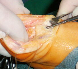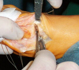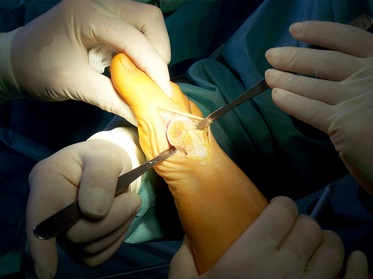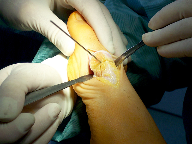 - Sterile Abdeckung des Operationsgebietes unter Einschluß der Ferse. Eventuell Abdeckung der nicht zu operierenden Zehen mit umgewendetem Operationshandschuh und/oder Tape.