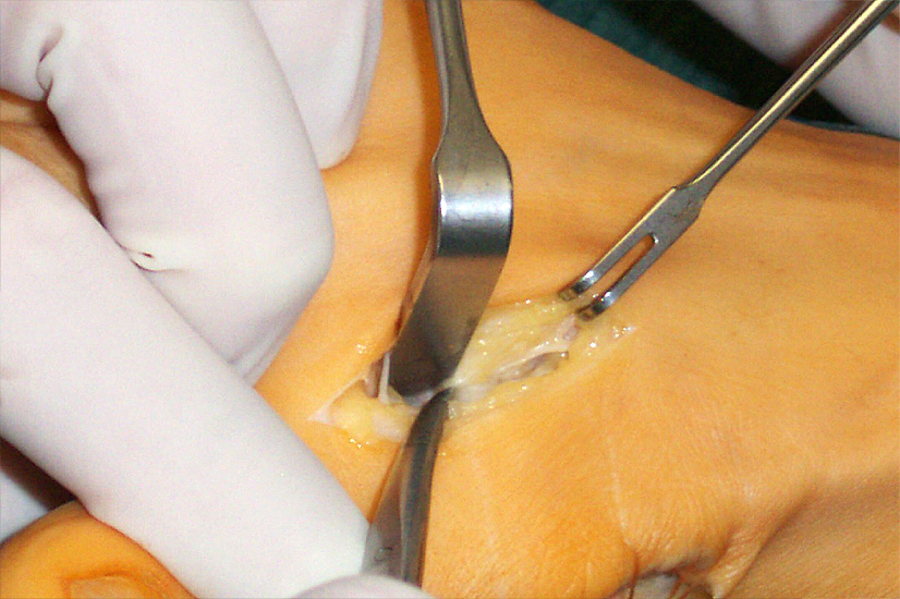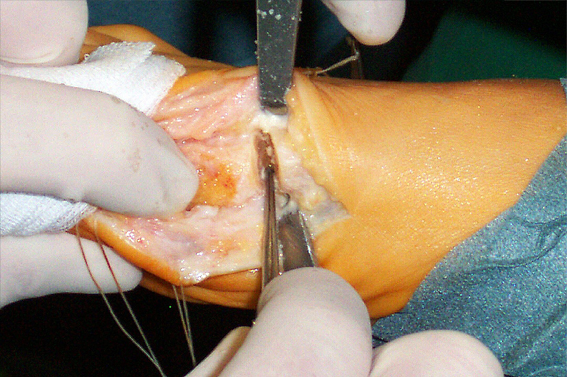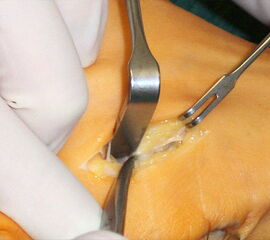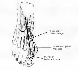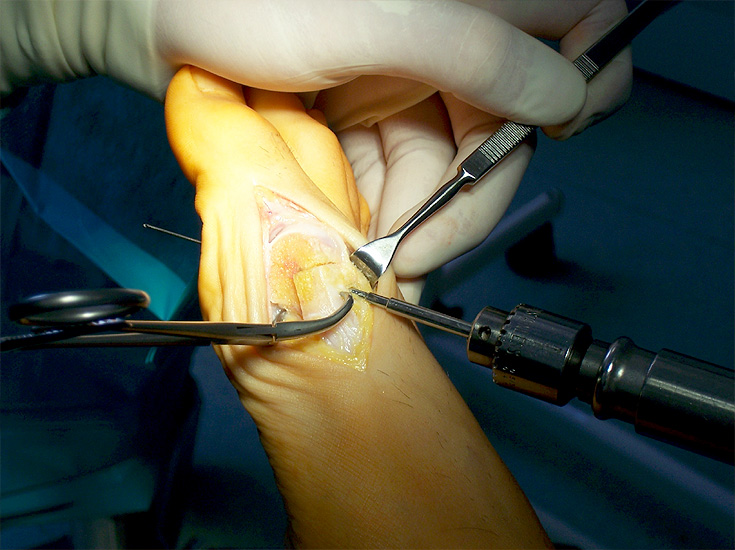 - Verletzung der langen Beuge- oder Strecksehne der Großzehe infolge eingeschränkter Sichtverhältnisse bei Präparation des lateralen Kapselrelease über medialen Zugang.